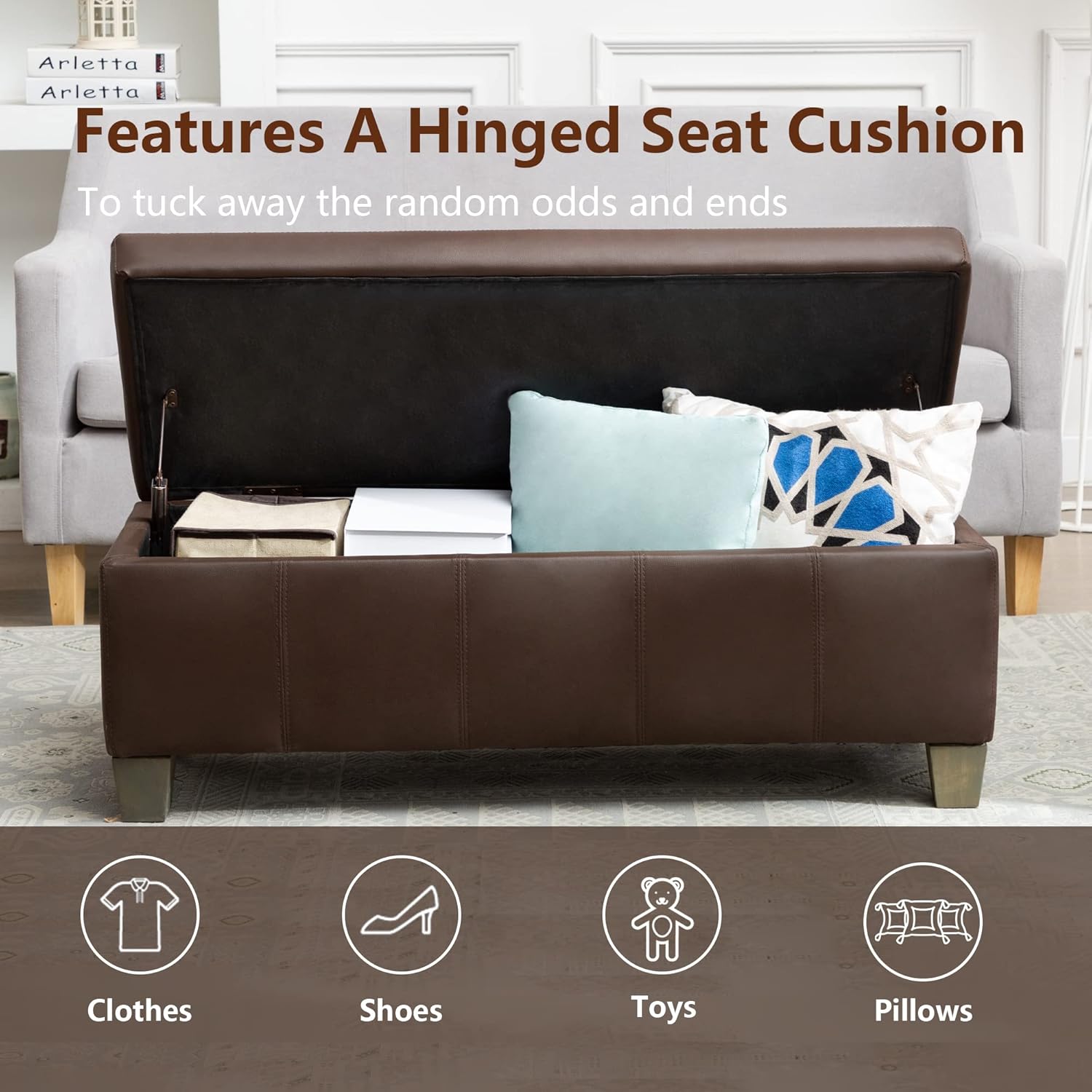 - SAFETY HINGE DESIGN: Safety hinges for ottoman design ensure the lid remains open until you put in/ put away all items, preventing it from slamming shut. This is a very worthwhile purchase for families with young children.