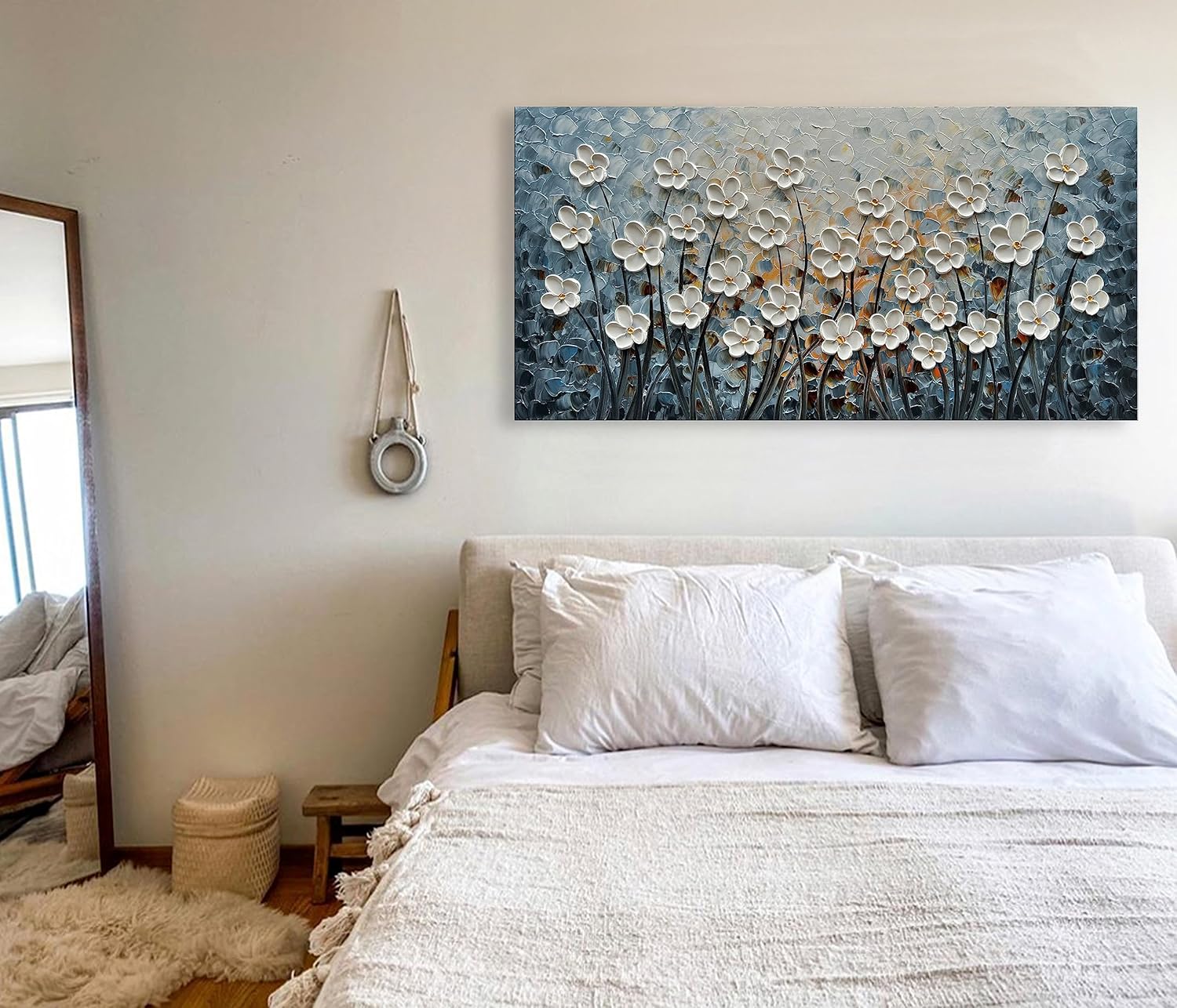 White Flower Canvas Wall Art Painting Hand-Painted Contemporary Art Works Living Room, Bedroom, Dining Room Wall Decoration 24x48 Inch
