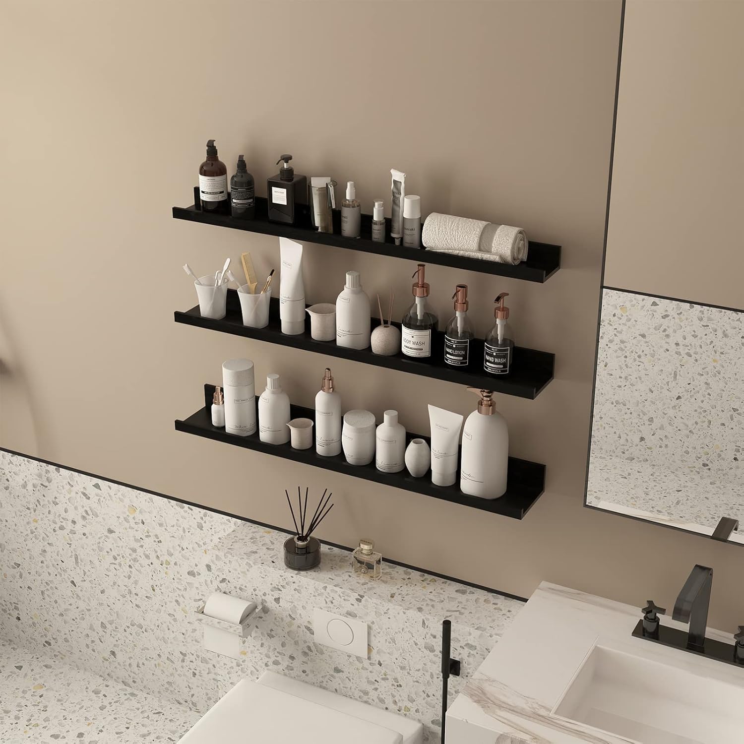 - Sturdy Wall Shelving: The wall shelfs are made of quality MDF wood. The black wooden shelves with rustic wood grain make them more attractive.
