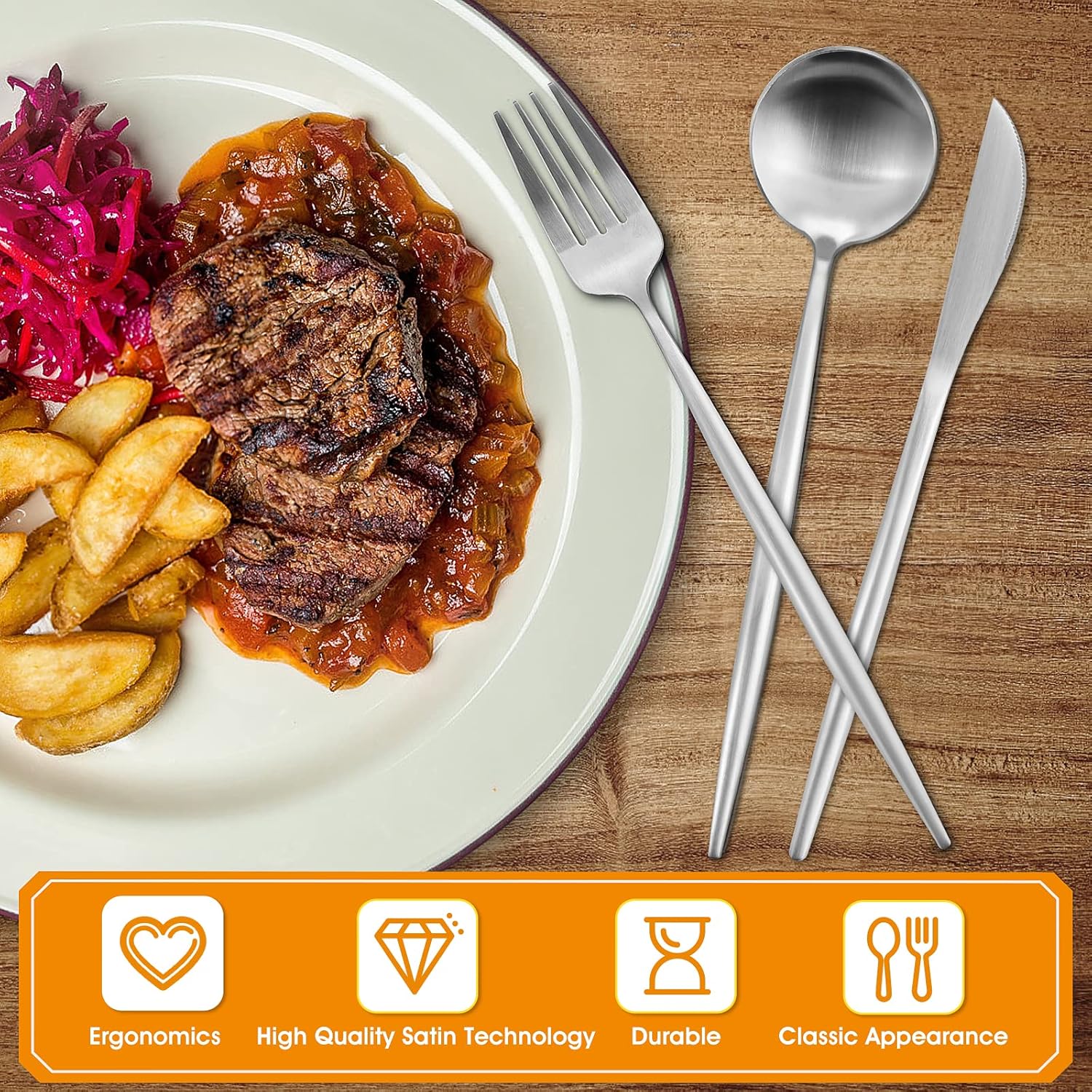 - Timeless Circular Design : Matte silverware set's round head design is simple but not simple, and elegant design is never out of date. Ergonomic design makes tableware easy to use.