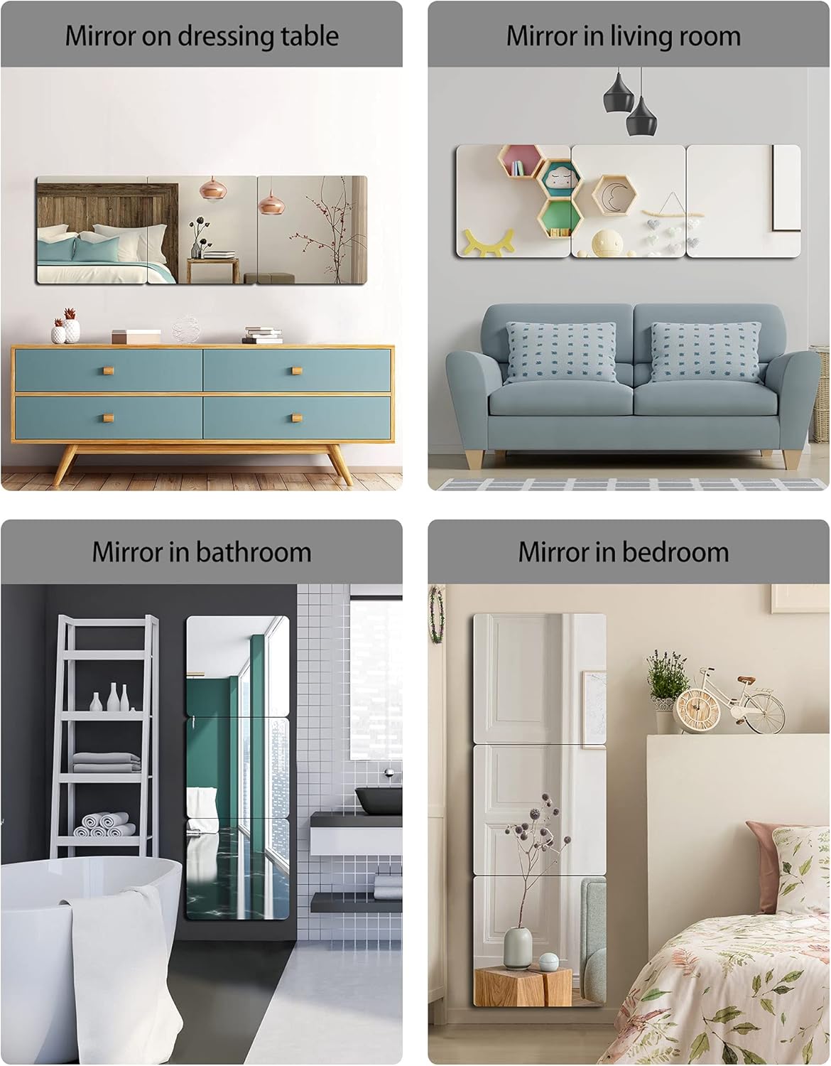 - ( Super Thick ): 1 pieces in total, Small mirror thickness: 0.1 inch, stumble mirror each about is 8 inch x 8inch, espejos para dormitorio ( 8 x 8 inch x 1 Pcs ), because our wall mirror full length thickness is 0.1 inch thick, so the definition is very high, door mirror the image is clear and undistorted. Small rounded corner design, very safe, will not hurt people