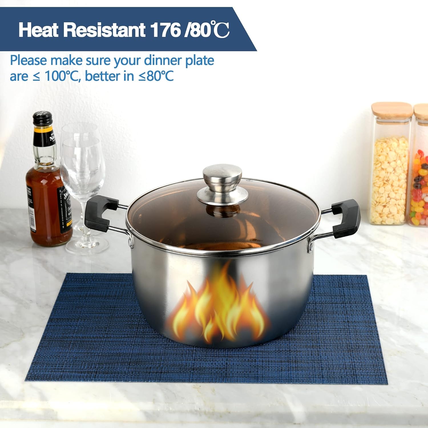 - Heat Resistant: Please make sure your dinner plate are β€ 100β, better in β€80β. It can prevent the table from slipping and scalding the countertop. These beautiful stylish vinyl place mats to add more fun to your dining table