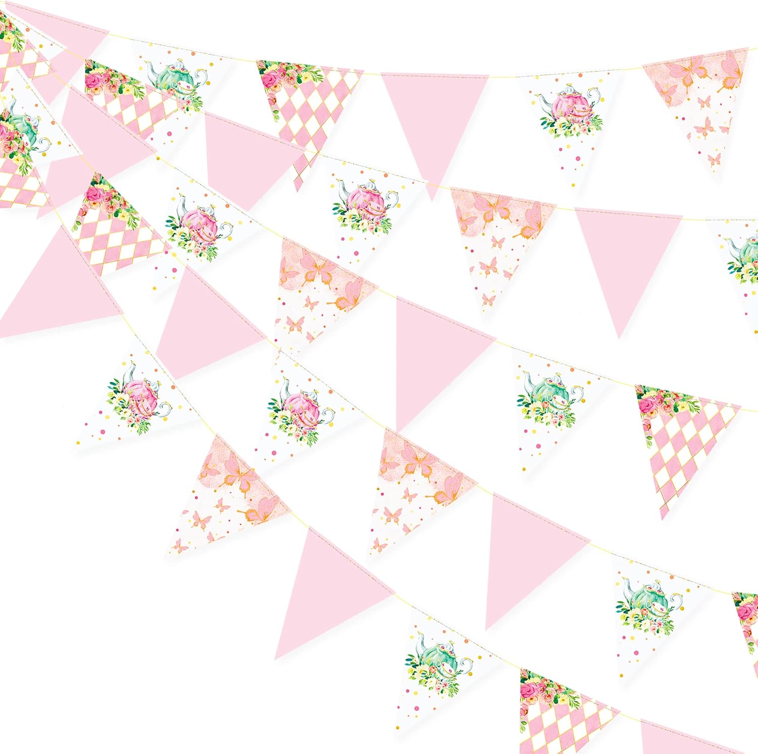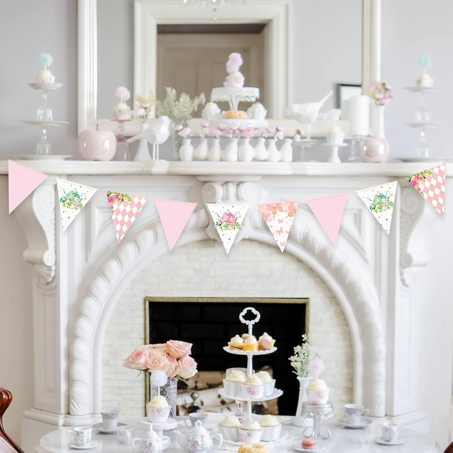 Spring Tea Party Decorations Pink and Gold Floral Flower Butterfly Teapot Teacup Plaid Paper Triangle Flag Pennant Banner Bunting for Spring Birthday Wedding Bridal Baby Shower Engagement Tea Party