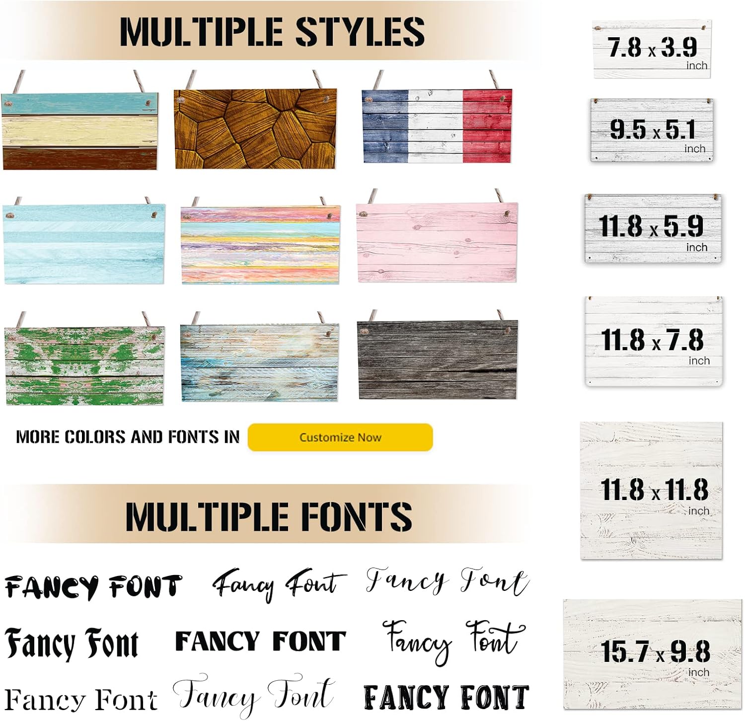 - 🟢Multiple Sizes and Backgrounds - We provide up to 100 different wood plank background colors, 20 different fonts and 50 font colors (in "Customize Now"), you can choose the one you like to design