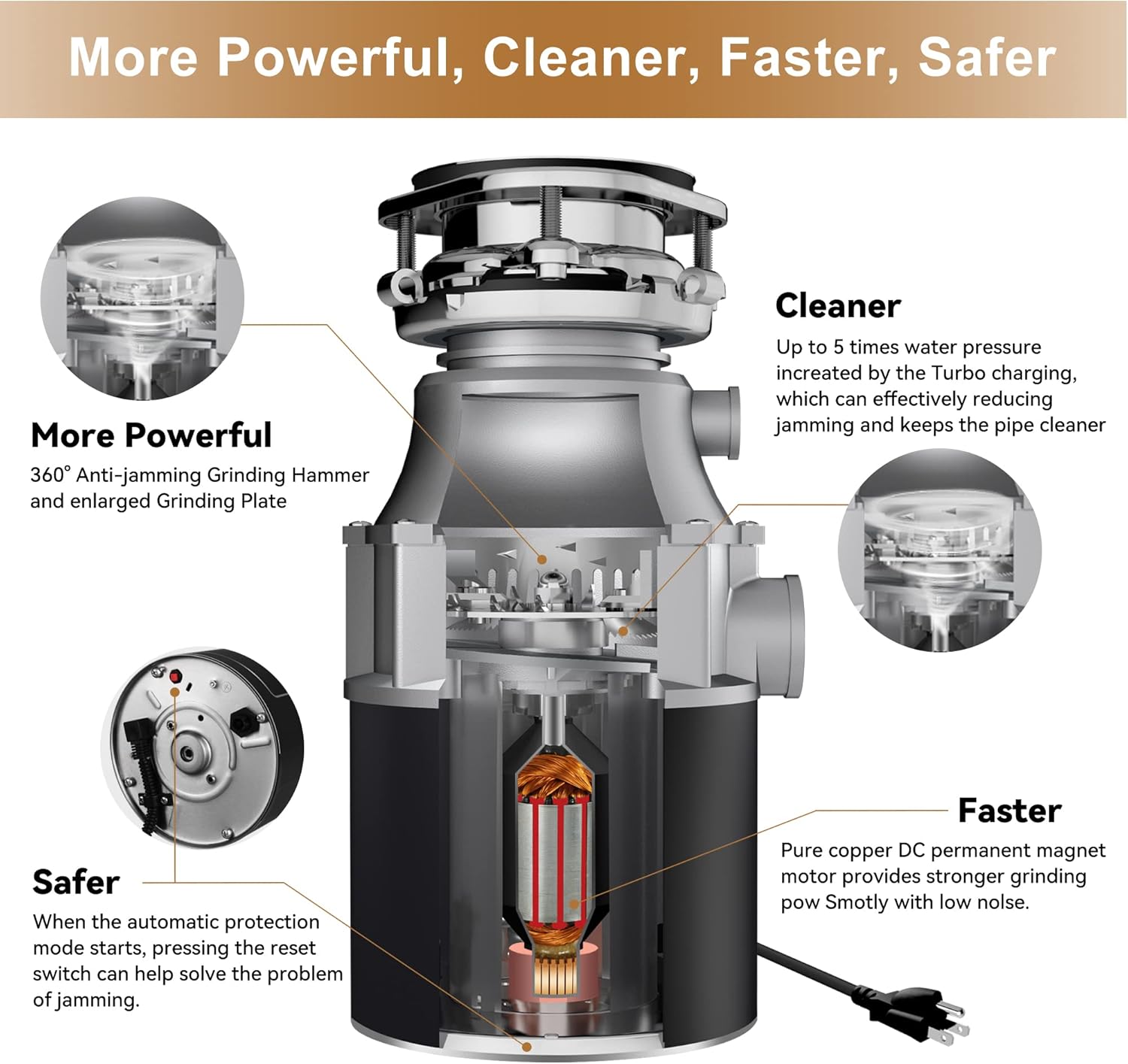 - Anti-jamming Design: Trifecte 3/4 hp Garbage Disposals has patented design for 360°anti-jamming grinding hammer, and the Exclusive turbocharging technology increases the water pressure by 5 times,discharging grinding scraps faster,more powerfully and effectively, reducing jamming so as to keep the pipe clean and extend the lifespan of the machine. Reset switch can be enabled when jamming.