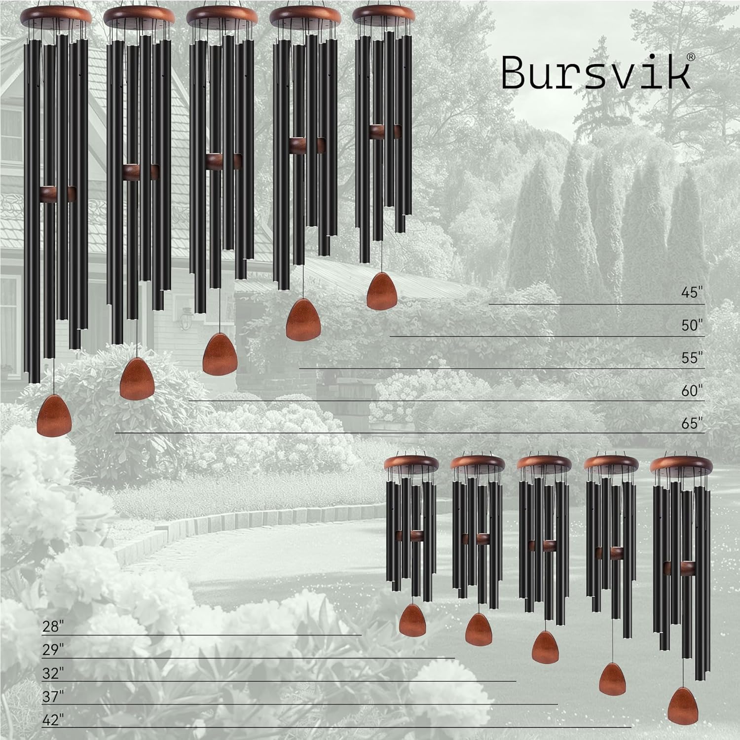 - ♪【Bigger and Better】The wind chime is made of aluminum pipe and pine. The total length of the wind chime from the top's S-shaped hook to the bottom's catcher is 37" Among them, six classic black anodized aluminum tubes have excellent corrosion resistance and wear resistance, and the length ranges from 8.7" to 12.6". The wood is made of wear-resistant and non-cracking pine. The adjustable wooden striker allows you to adjust your favorite position at will.