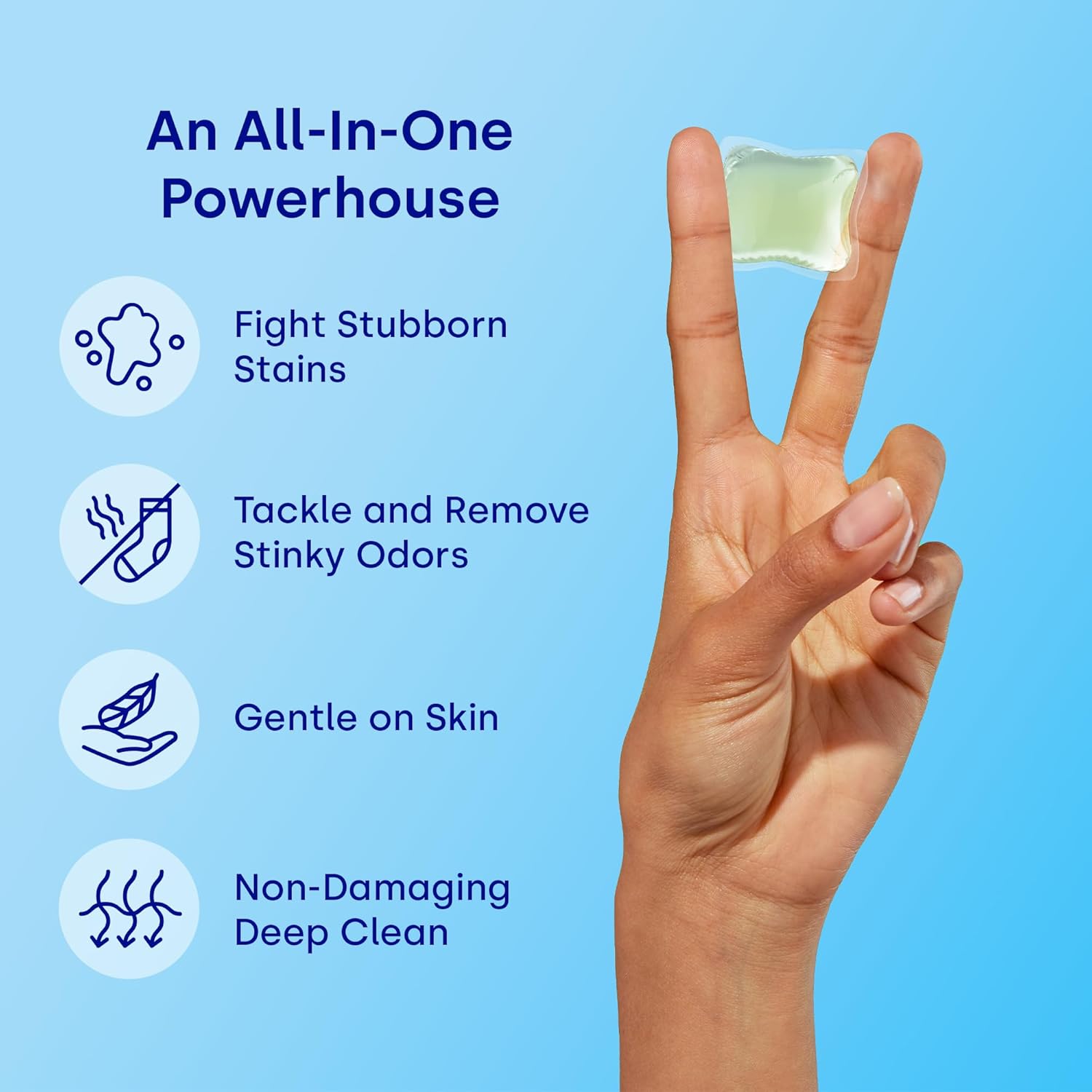 - TARGETED ODOR ELIMINATION & POWERFUL STAIN REMOVAL: Our detergent pods are expertly crafted with five specialized enzymes to combat stubborn stains and innovative malodor technology to eliminate unpleasant odors. Ideal for everyday fabrics such as cotton, athletic wear, and polyester. Our unscented formula contains no added fragrances, making it ideal for those who prefer a fragrance-free option or have sensitive skin.