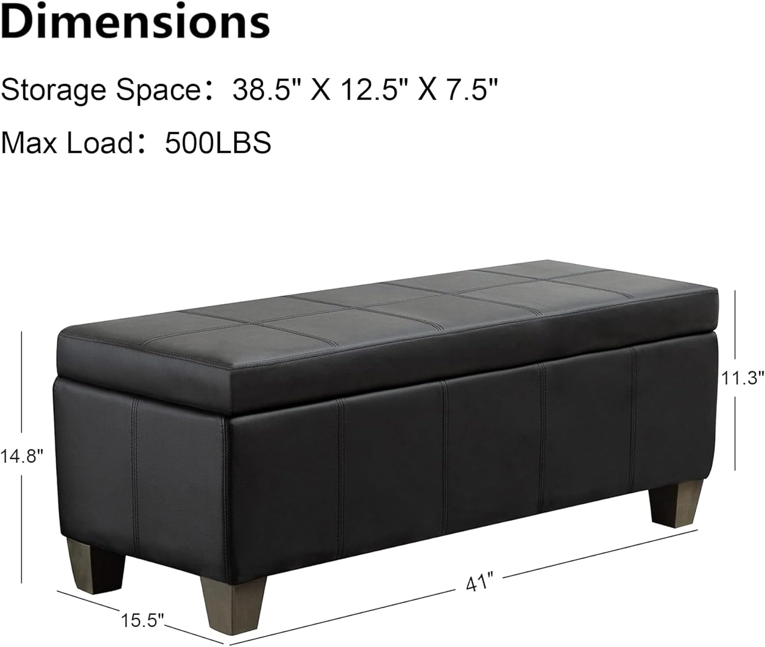 - OVERALL DEMENSION: The overall size of UDAX faux leather ottoman is 41β*15.5β*14.8β and the inside storage dimension is 38.5β*12.5β*7.5β. Our storage bench is wide enough to sit cozily and large enough to store your blanket, clothes, children's toys, and so on. It has plenty of space to help you organize every corner of your home.