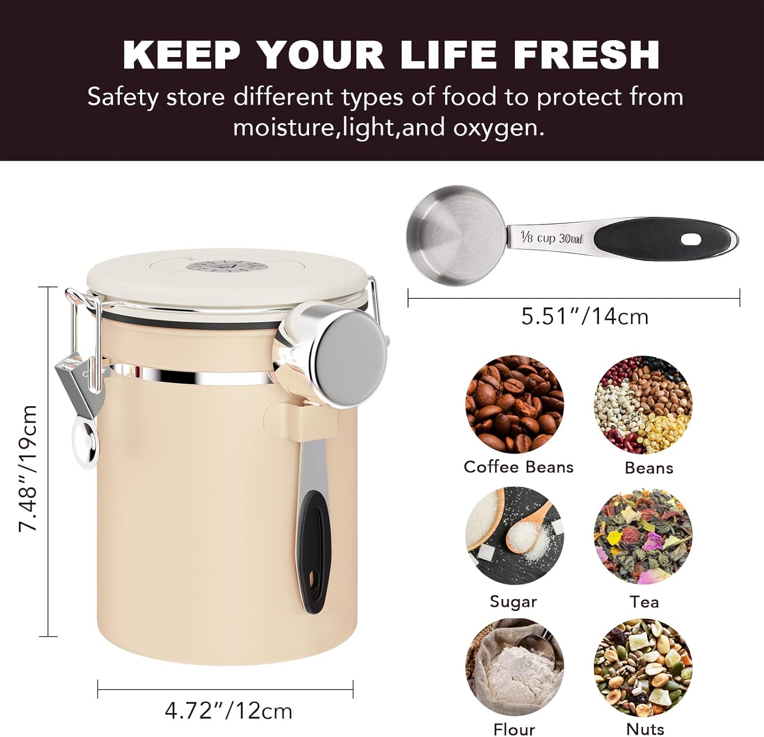 - 【STAINLESS STEEL COFFEE CONTAINER】Made from high-quality 304 stainless steel, the opaque body creates an ideal environment for storing coffee beans. The canister blocks out light and moisture to protect your ingredients—whether they’re coffee beans, dried nuts, or other pantry staples.Its robust construction offers long-lasting durability.