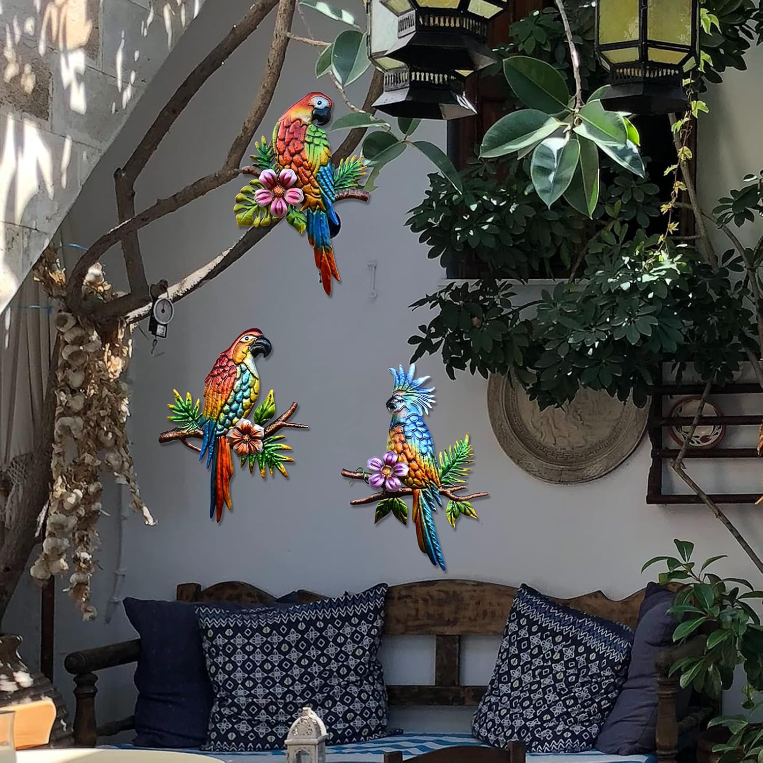 - 【Wide Application】This Outdoor Tropical Decor Is Ideal For Indoor And Outdoor Decoration, Suitable For Bedroom, Living Room, Garden, Backyard, Balcony, Patio, Metal Porch Or Outdoor Fence Decoration. 3 Adorable Parrots Add Color To Your Living Space.