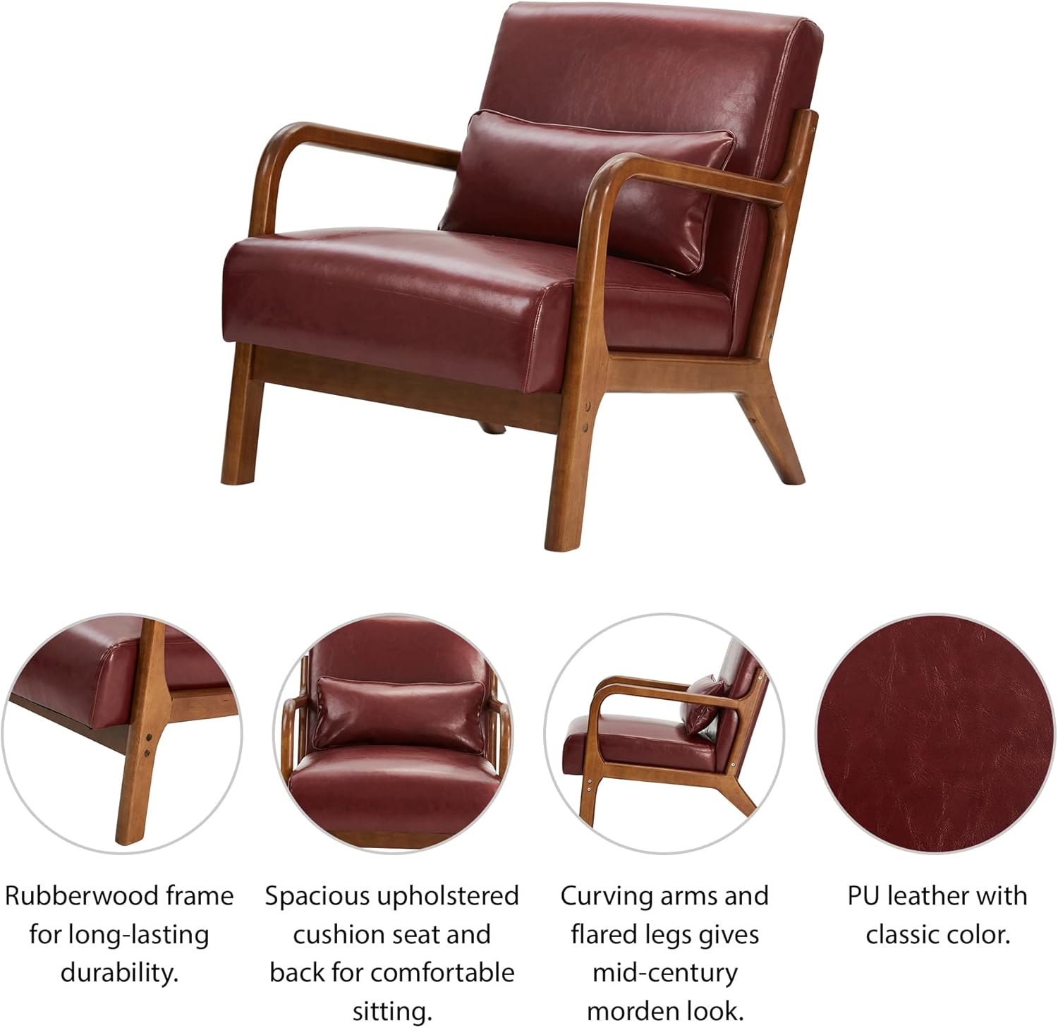 Glitzhome 2 Set Mid Century Red Accent Armchair, Single Reading Armchair PU Leather Lounge Chair with Walnut Ruberwood Frame