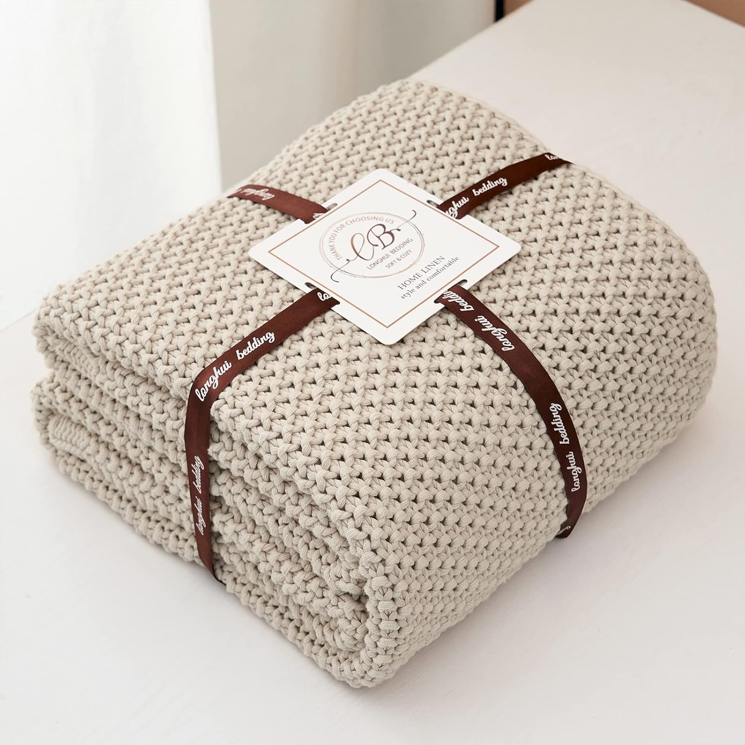 Longhui bedding Chunky Cable Knit Throw Blanket Lightweight Beige 100% Organic Cotton Blanket for Sofa Couch Bed Baby Nursery, Rustic Shabby Chic Modern Farmhouse, 51” x 63” Give Laundering Bag