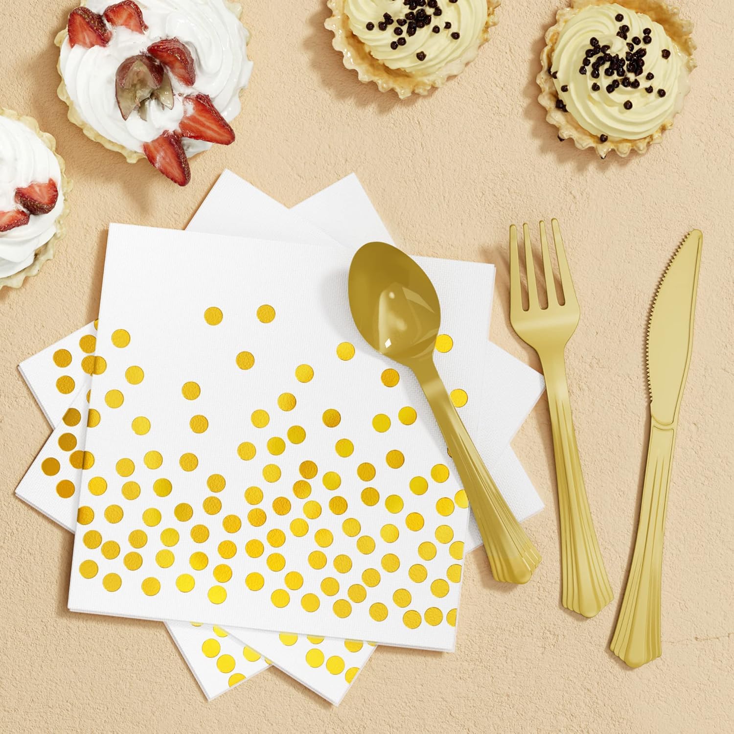 - WHITE AND GOLD PARTY SUPPLIES: These attractive golden foil dot on white party dinner paper plates, dessert plates, cups, napkins sure to be loved by everyone. Along with golden plastic forks knives and spoons, which festive atmosphere to the celebration. The whole set presents an understated luxury texture that adds a sophisticated elegant, modern feel to your party. Perfect choice for a white and golden Sweet Happy any themed party.