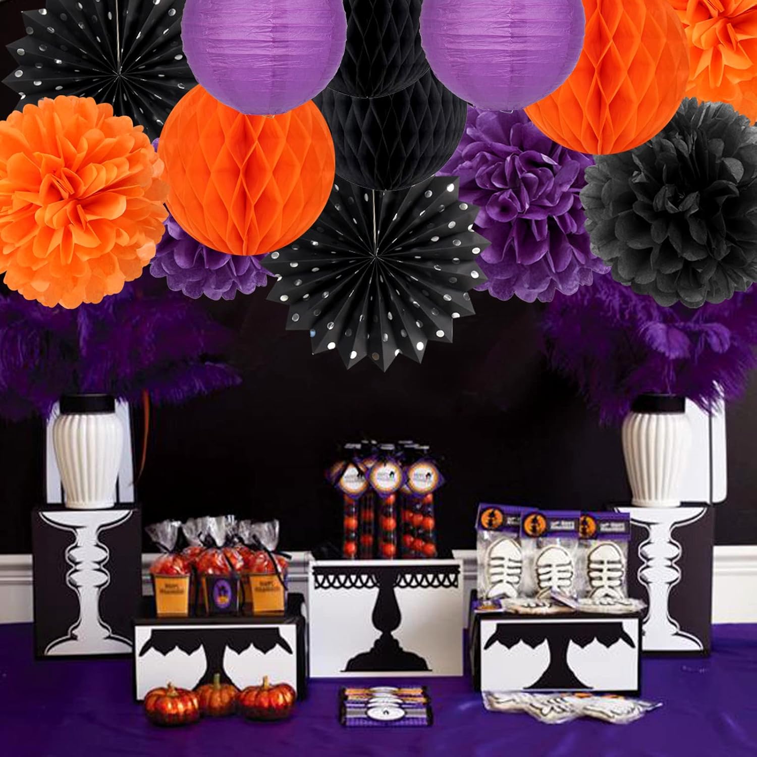 Black Orange Purple Halloween Party-Decorations - 14pcs Kits Paper Lanterns Fan,Tissue Flower Pom Poms Streamers,Honeycomb Balls,Graduation Birthday Wedding Baby Bridal Shower Decor Lasting Surprise