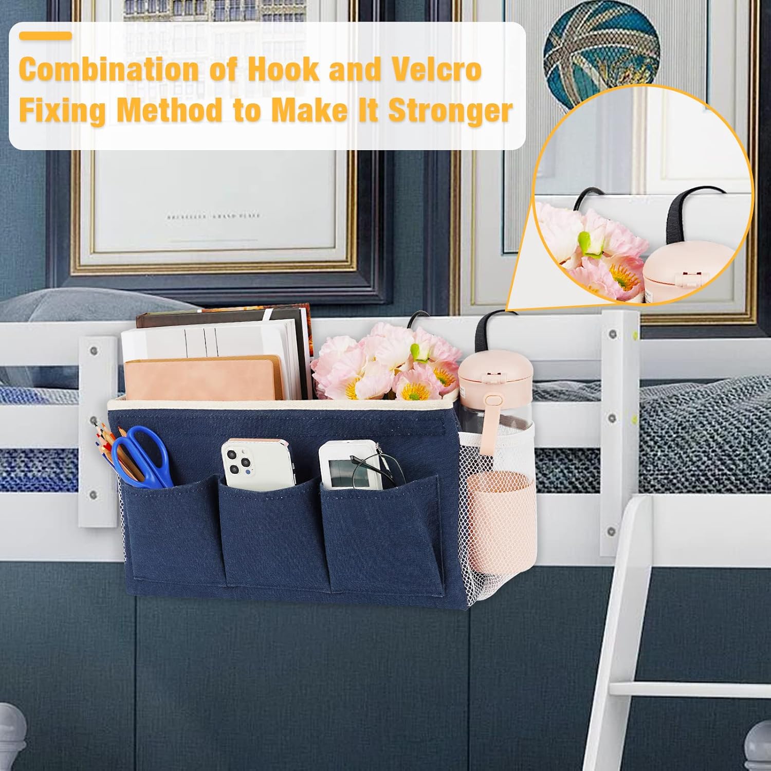 - ăStrong Bearing CapacityăIn addition to the metal hook, the bedside caddy also added adjustable straps on both sides to help the bedside organizer to be additionally fixed in place, enduring enough to bear heavy weight and prevent sagging.