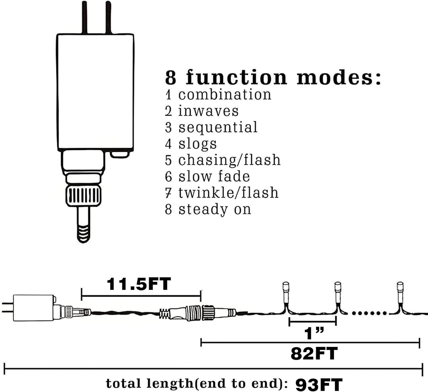- Light Specifications: With 1000 LED lights, each Christmas string lights is 93.5 ft long in total, wire with LED bulbs is 82 ft, lead cord without lights is 11.5 ft, spacing between per LED bulb is 1 inch. Waterproof design allows it to be used indoors and outdoors. NOTE: this LED string lights could not be extended or connected together.
