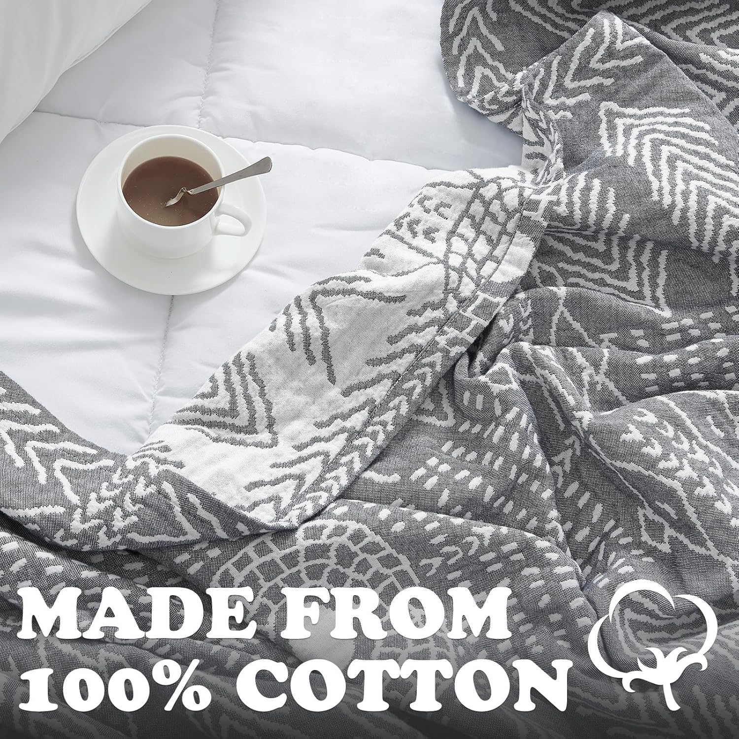 jinchan Boho 100% Cotton Muslin 50x60 Throw Blanket Lightweight 3 Layer Grey Blanket Washable Reversible Breathable Decorative Geometric Striped Patterned Gray Soft Cozy for Sofa Bed All Season Gift