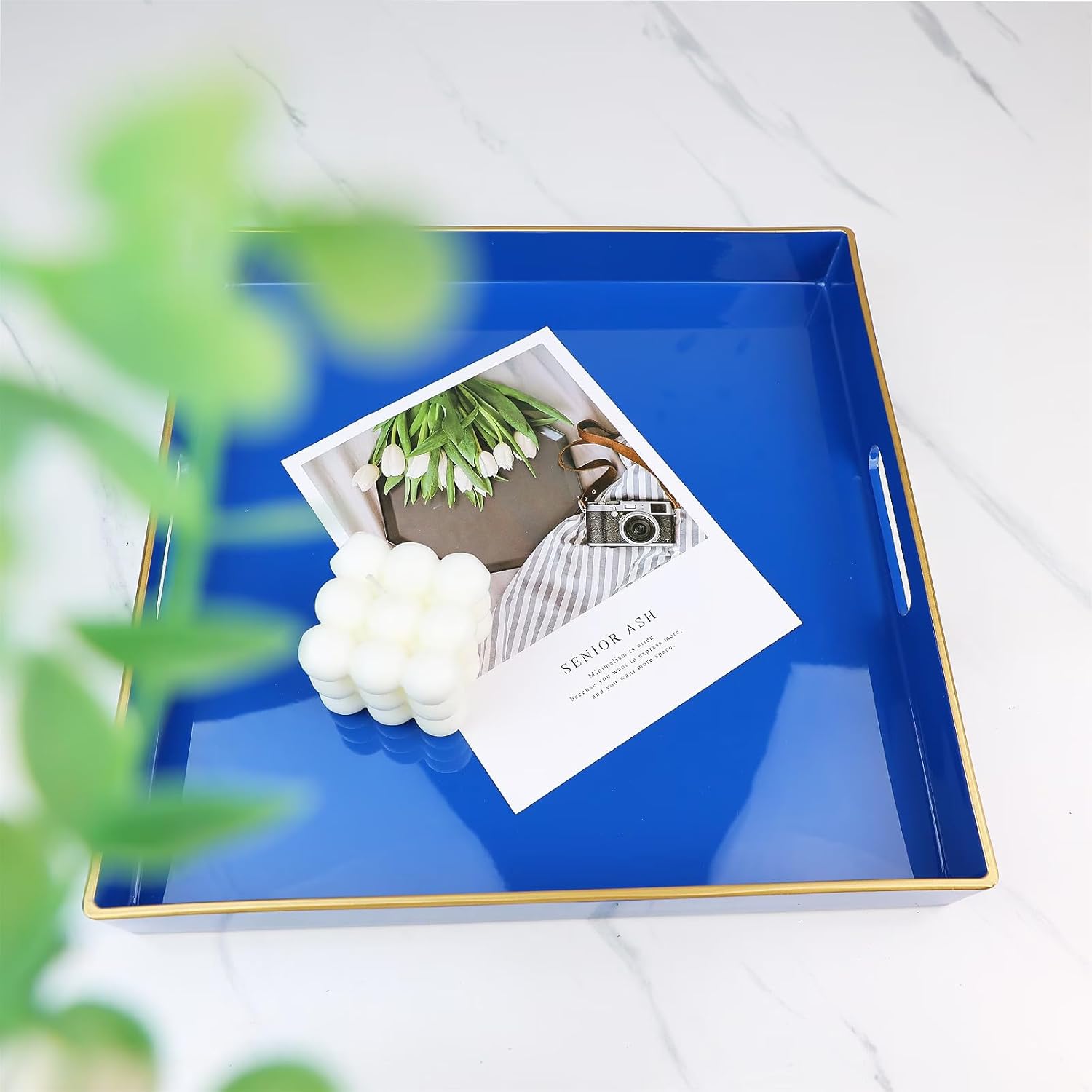 Spsyrine Blue Decorative Tray for Living Room, Square Modern Plastic Coffee Serving Table Tray for Ottoman Bathroom Kitchen,13"*13"
