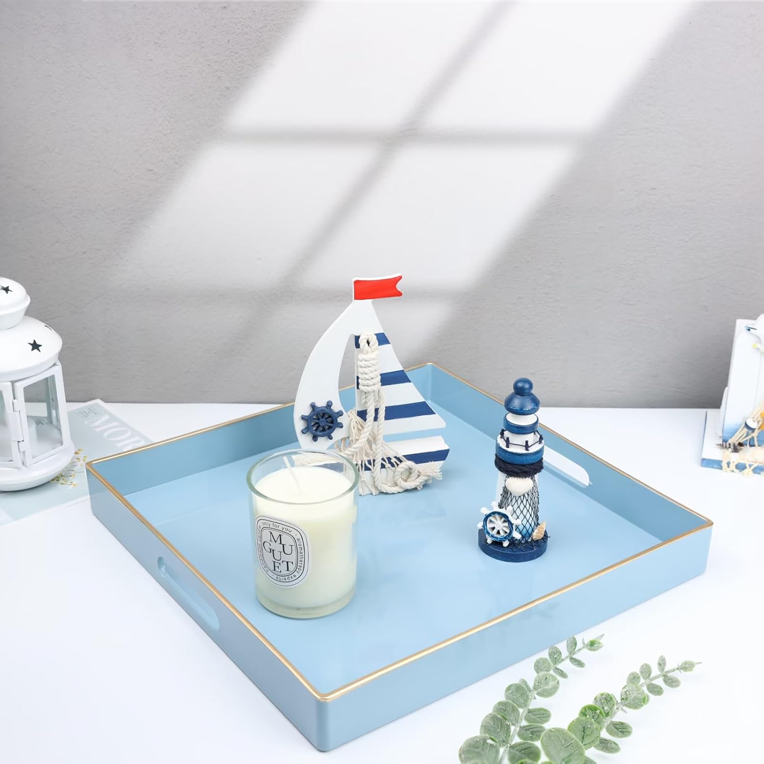 Spsyrine Light Blue Decorative Tray for Living Room, Square Modern Plastic Coffee Serving Table Tray for Ottoman Bathroom Kitchen, 13"*13".
