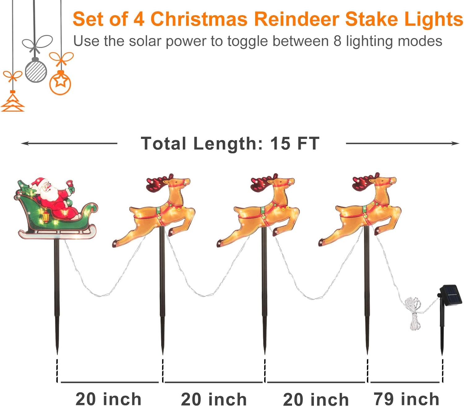 - Eye-catching Design: This lovely silhouette stakes feature a decorated flying Santa in sled with 3 reindeer with rich color and 30 warm white LEDs to enhance the 4-piece reindeer set. Double-sided design can be viewed from both directions