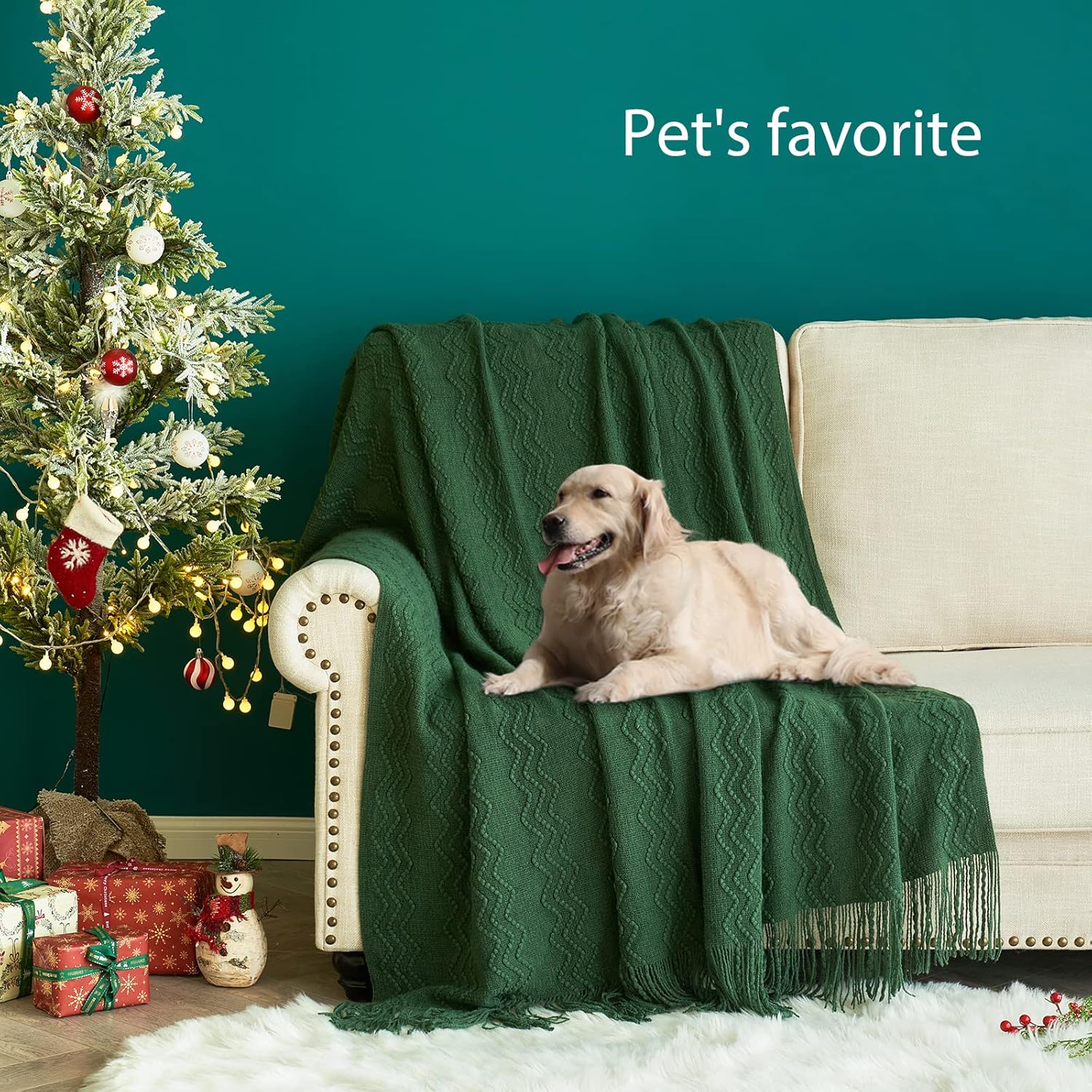 MIULEE Dark Green Knitted Throw Blanket for Couch Boho Textured Cozy Woven Blanket with Tassels for Sofa Chair Bed Living Room Acrylic Wave Pattern 50"x60"