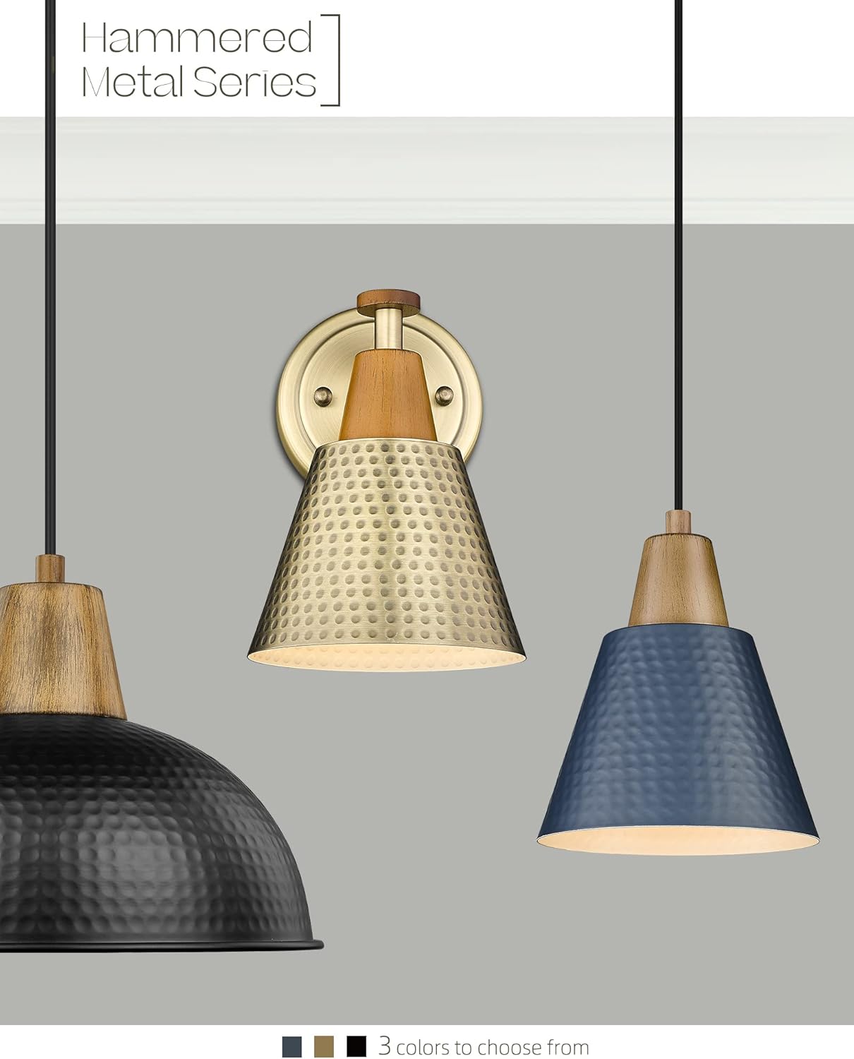 - 【Modern & Industrial Design】The antique brass sconces set of 2 create a sleek and minimalist look. Unlike other traditional design,this bathroom sconce wall lighting has hammered metal shade and wood grain paint finish on the top,making itself modern yet tasteful!