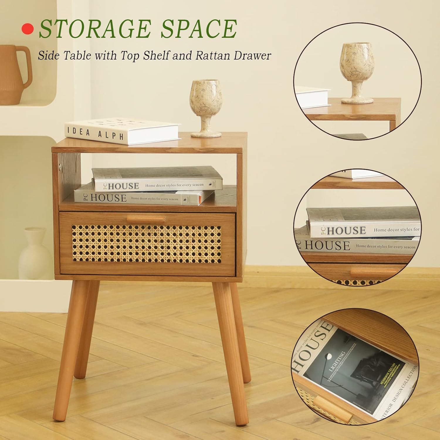 - Sturdy Side Table: The solid wood legs, elegant square tabletop, walnut colour surface and natural rattan constituted this mid century nightstand. It is ready to hold everything you need with easy reach