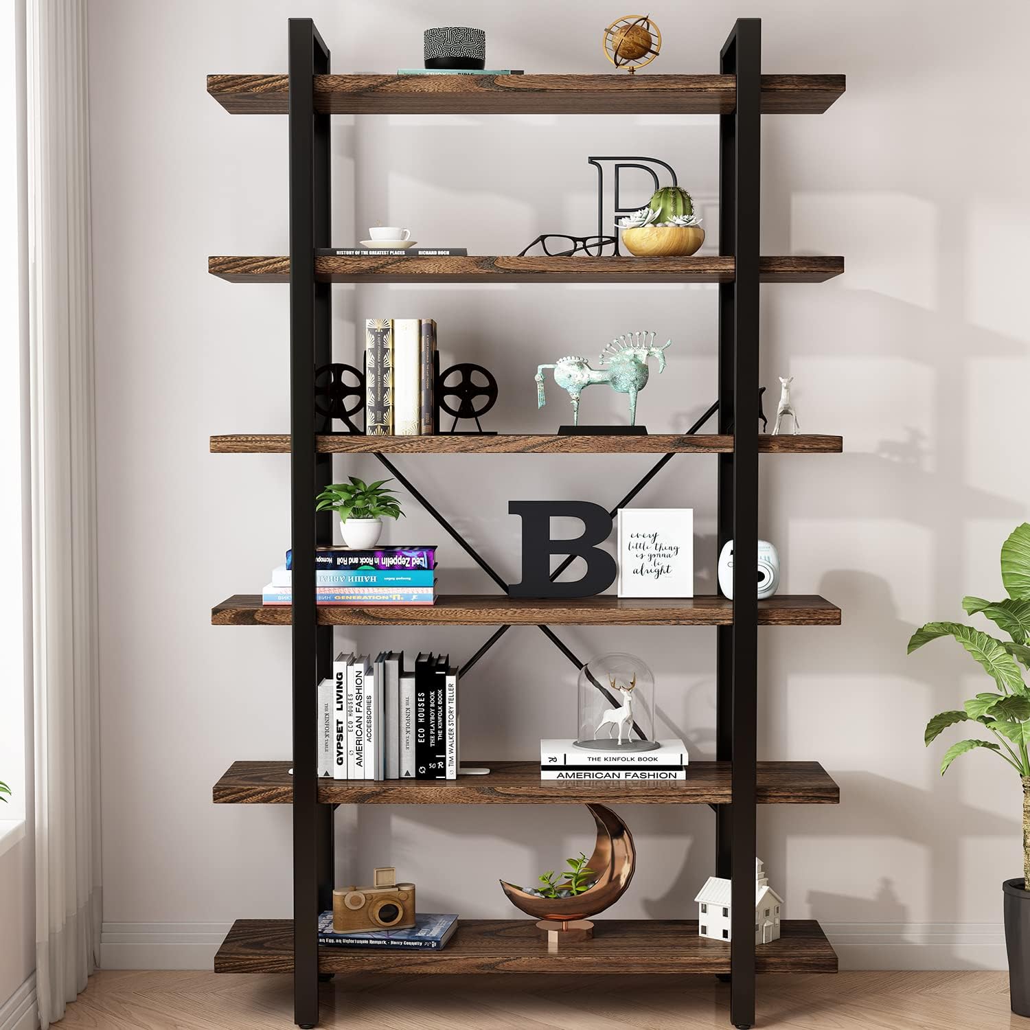 Solid Wood Bookcase and Book Shelves Wood and Metal Shelving Unit 6 Tier Bookshelf Modern Rustic Open Bookshelf Office,Distressed Brown (AY-02-6Tier)