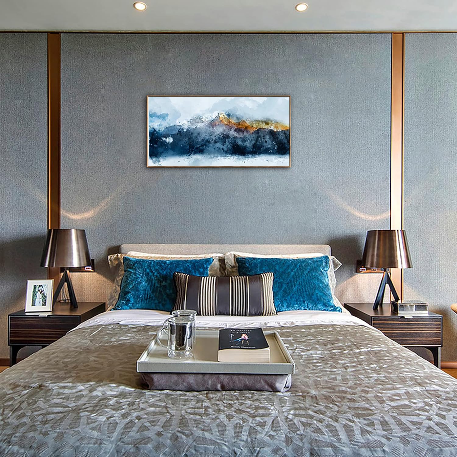 Framed Canvas Wall Art Indigo Abstract Mountain Pictures Wall Decor Blue Grey Orange Mountain Peaks Canvas Painting Prints Modern Abstract Artwork for Living Room Bedroom Decoration 24" x 48"