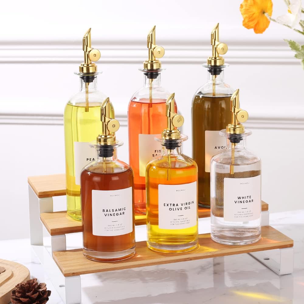- Modern Kitchen Essential: Minimalism Inspired Cooking Oil Dispenser Bottle. This Set Includes Two High-quality 16.9Oz (500 Ml) Glass Bottles, Two Gold Pourers, a funnel, and a 36 Label Set.