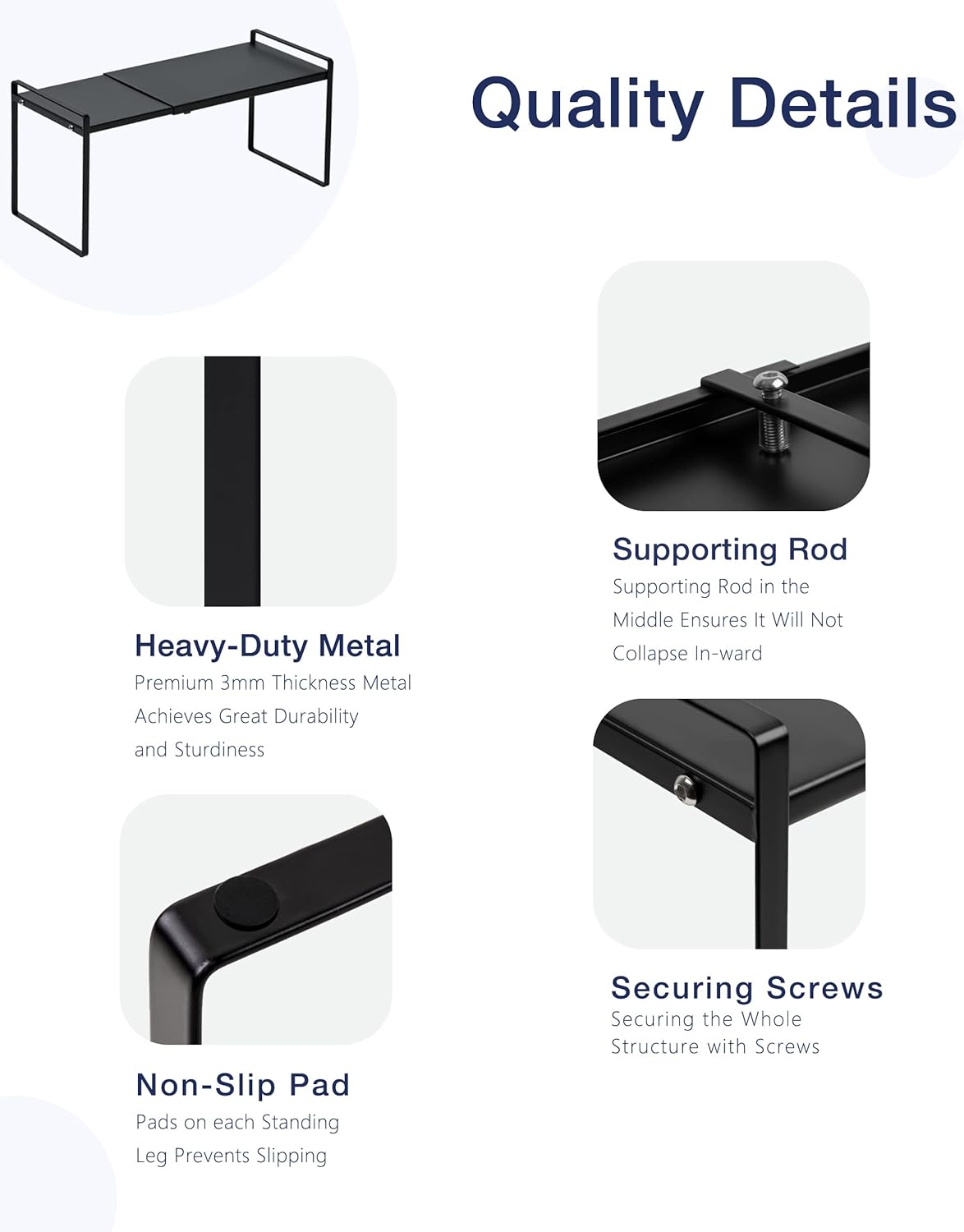 Nxconsu Expandable Cabinet Shelf Organizer Riser for Kitchen Pantry Cupboard Under Sink Countertop Home Storage Organization Rack Space Saver Freestanding Heavy Duty Nonslip Stackable Black Large