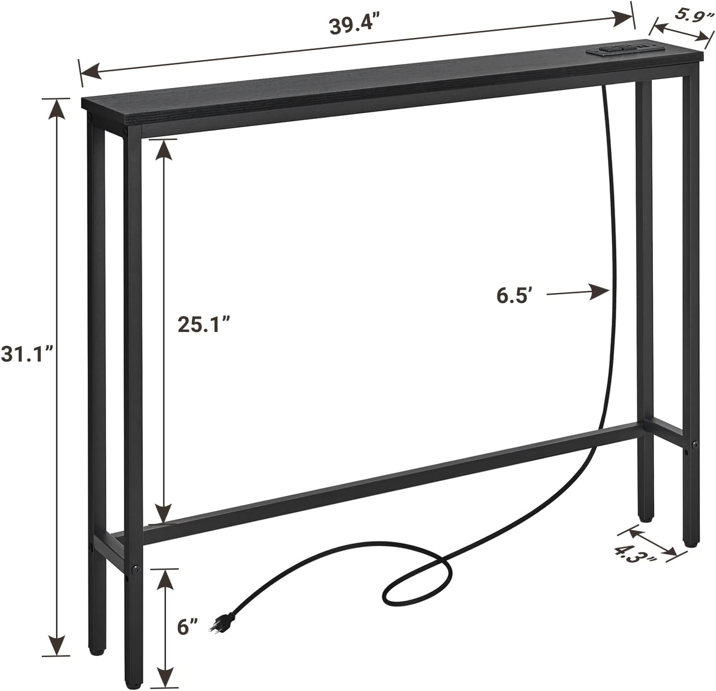 ELYKEN 5.9" Narrow Console Sofa Table with Power Outlets, 5.9" Dx39.4 Wx31.1 H Long Black Behind Couch Table with Metal Frame and Charge Station with 6.5’ Extension Cord