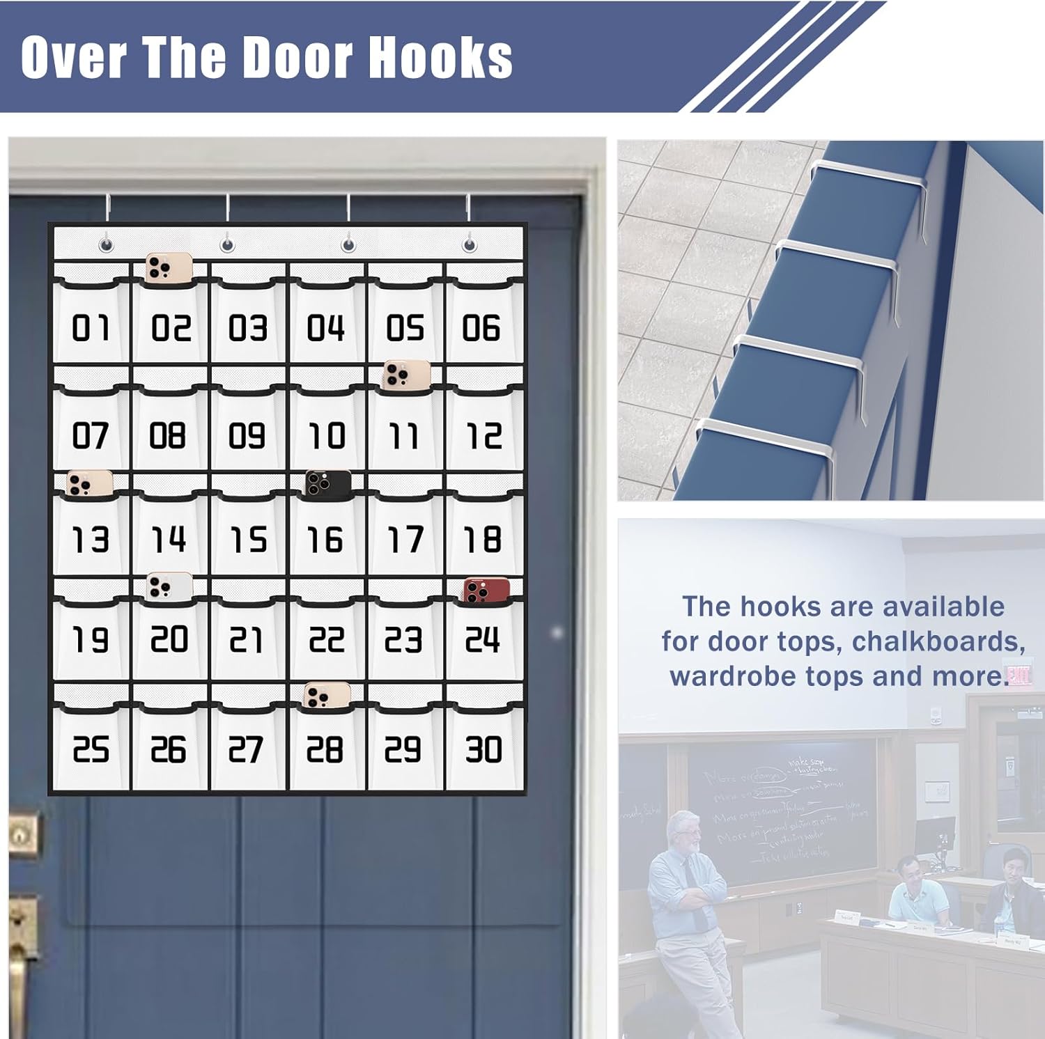 - ă4 Metal Hooks for Classroom Pocket Chartă Calculator Phone pouch fit the top of whiteboard or over the door as thick as 1.3"-2", hanging organizer with pockets supports the weight of 30 phones (about 20 lb), easy to install and close the door.