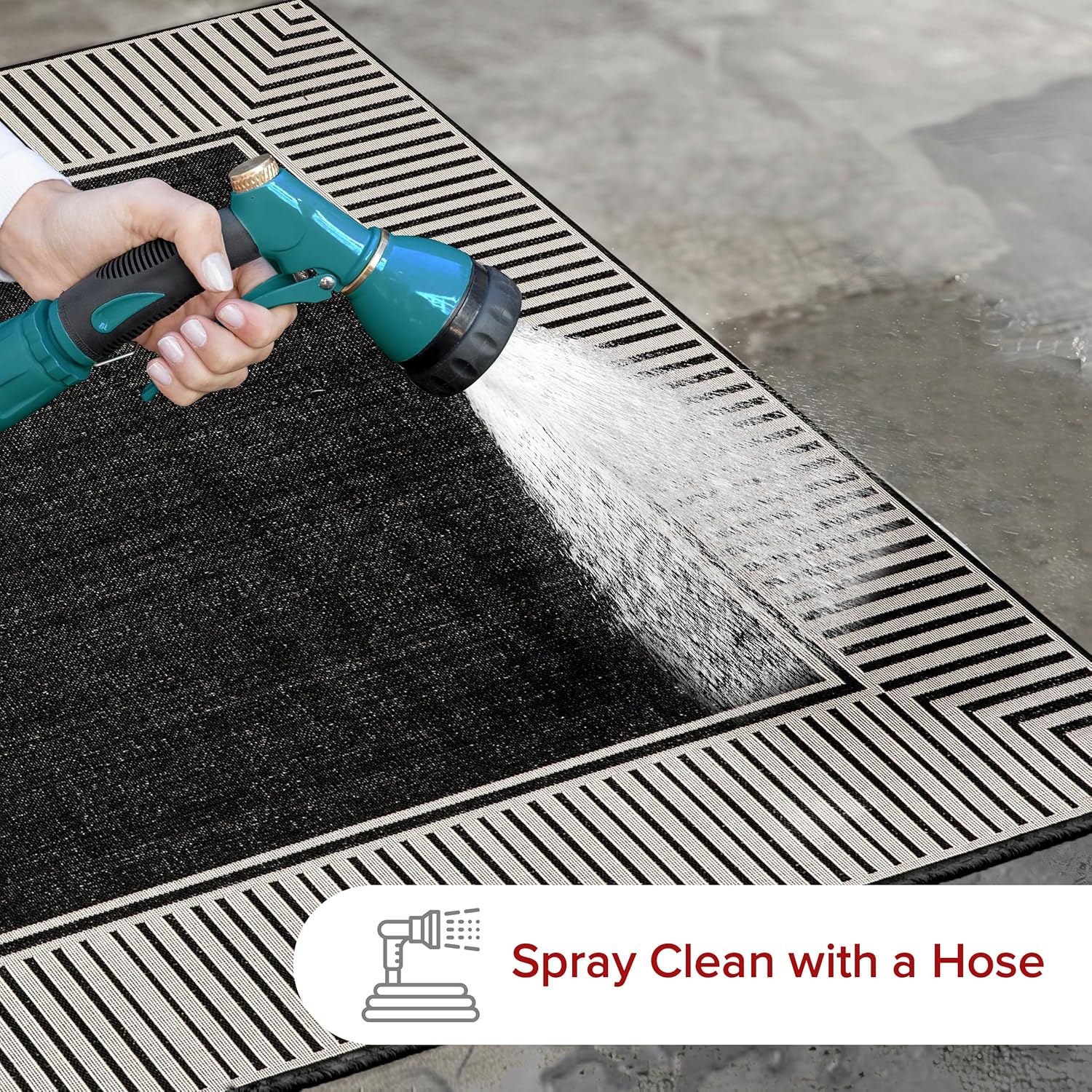 - Outdoor Rug Care Instructions: Easy to care for, simply shake out your outdoor rug to remove any light dirt or debris and spray your area rug with a hose for stubborn stains. This is the perfect patio rug or front porch rug to elevate your home.