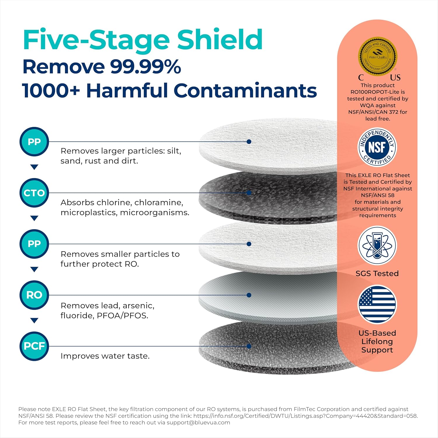 - SPACE-SAVING DESIGN + YEARLY MAINTENANCE: The ROPOT-Lite offers a compact 5-stage filtration system, perfect for 1-2 people, with easy annual filter replacement. Certified by WQA against NSF/ANSI/CAN 372 for lead-free and tested by SGS, it uses a 0.0001ÎĽm RO membrane to effectively reduce harmful contaminants, including TDS, PFOA, PFOS, Chlorine, Fluoride, Arsenic, Lead, and more. Enjoy pure, healthy water that fits seamlessly into your living space.