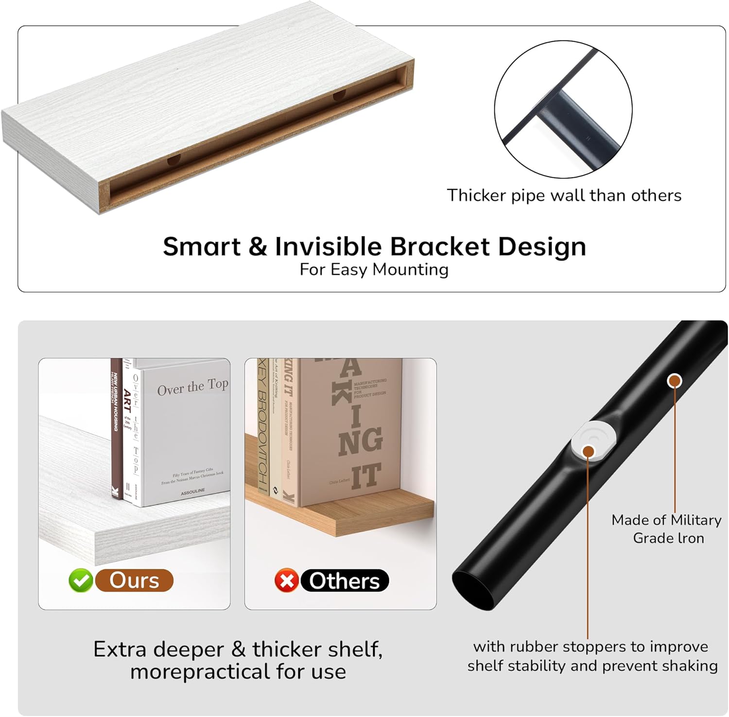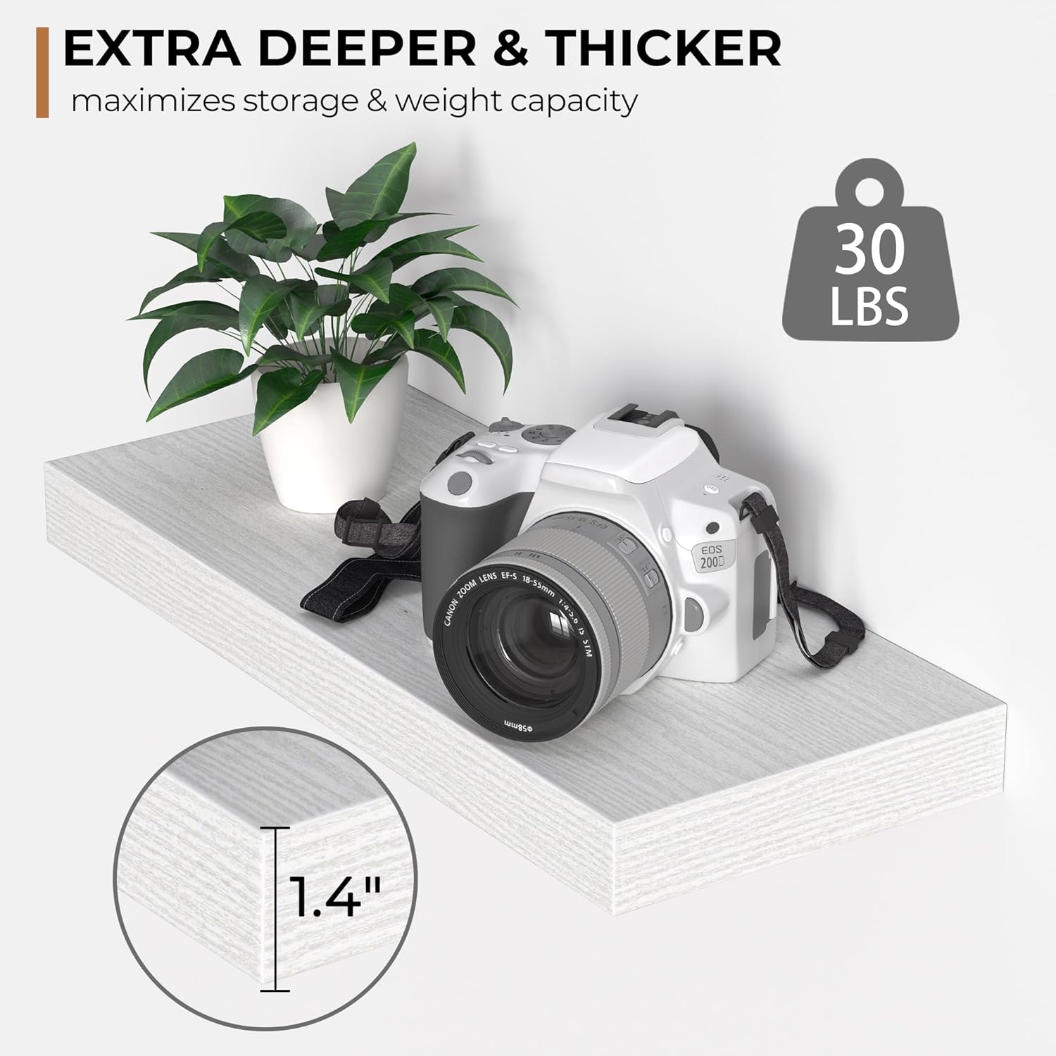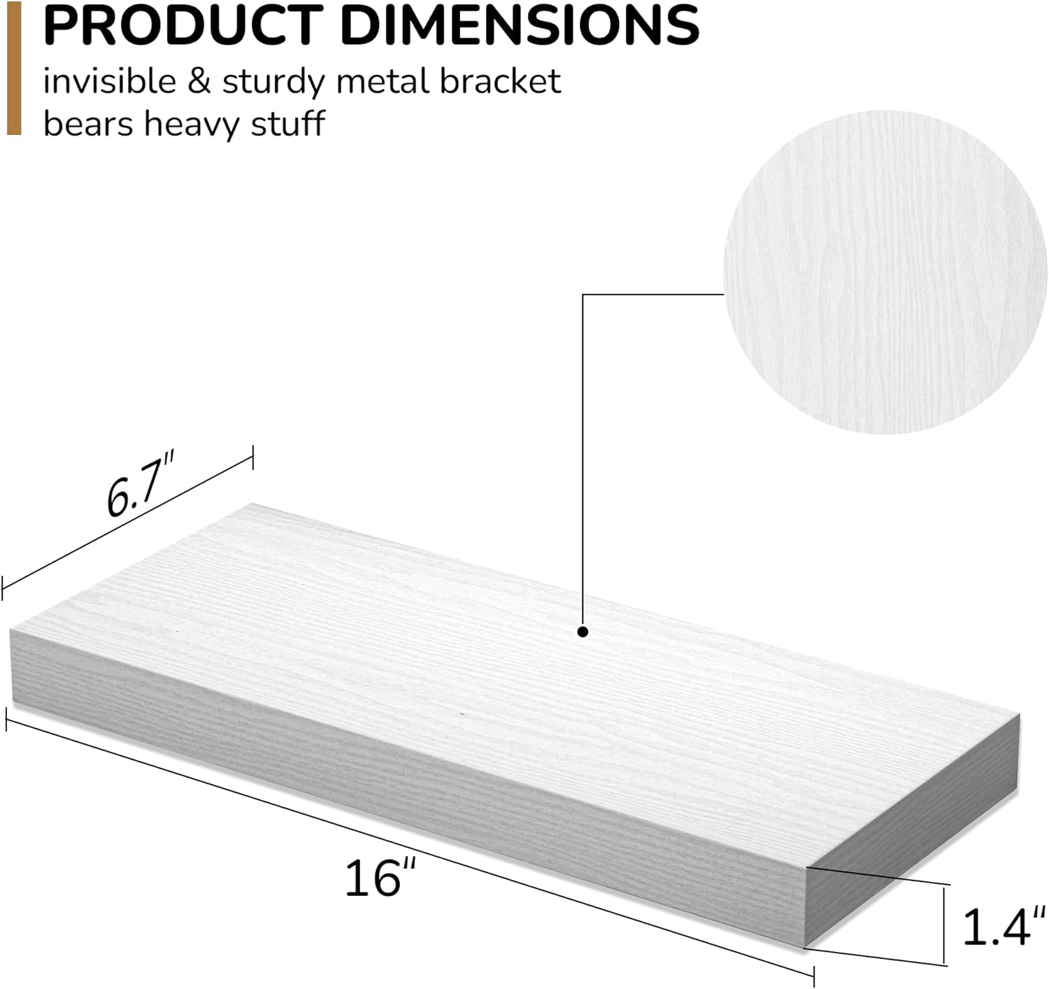 - Extra Deeper & Thicker - Each board measures 16"W x 6.7"D x 1.4"H. Extra deeper and thicker design in order to bring maximizes storage space and weight capacity, even hold up to 30 lb each. This floating shelf taking up zero square feet, reduces clutter and highlights dรฉcor in compact spaces.