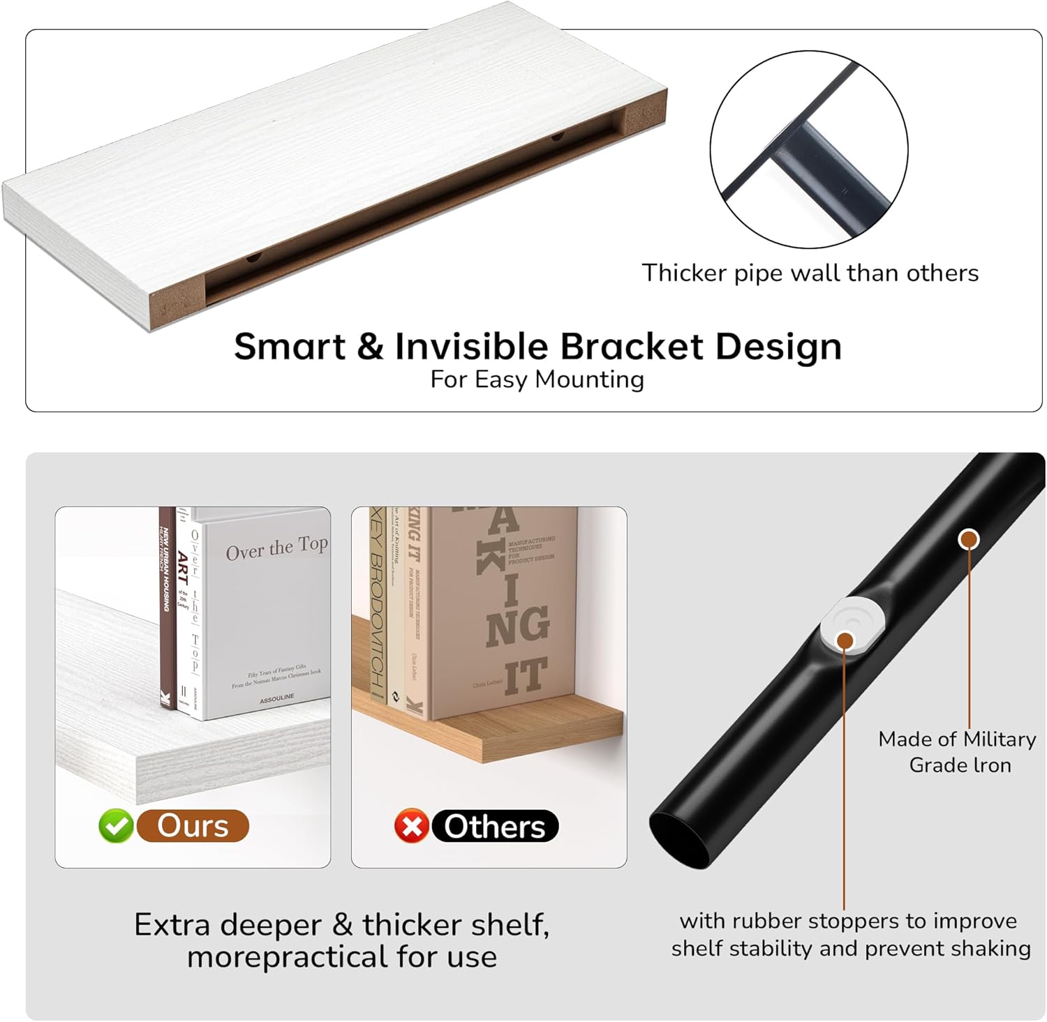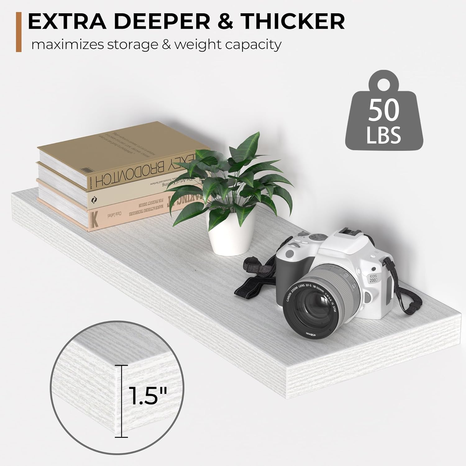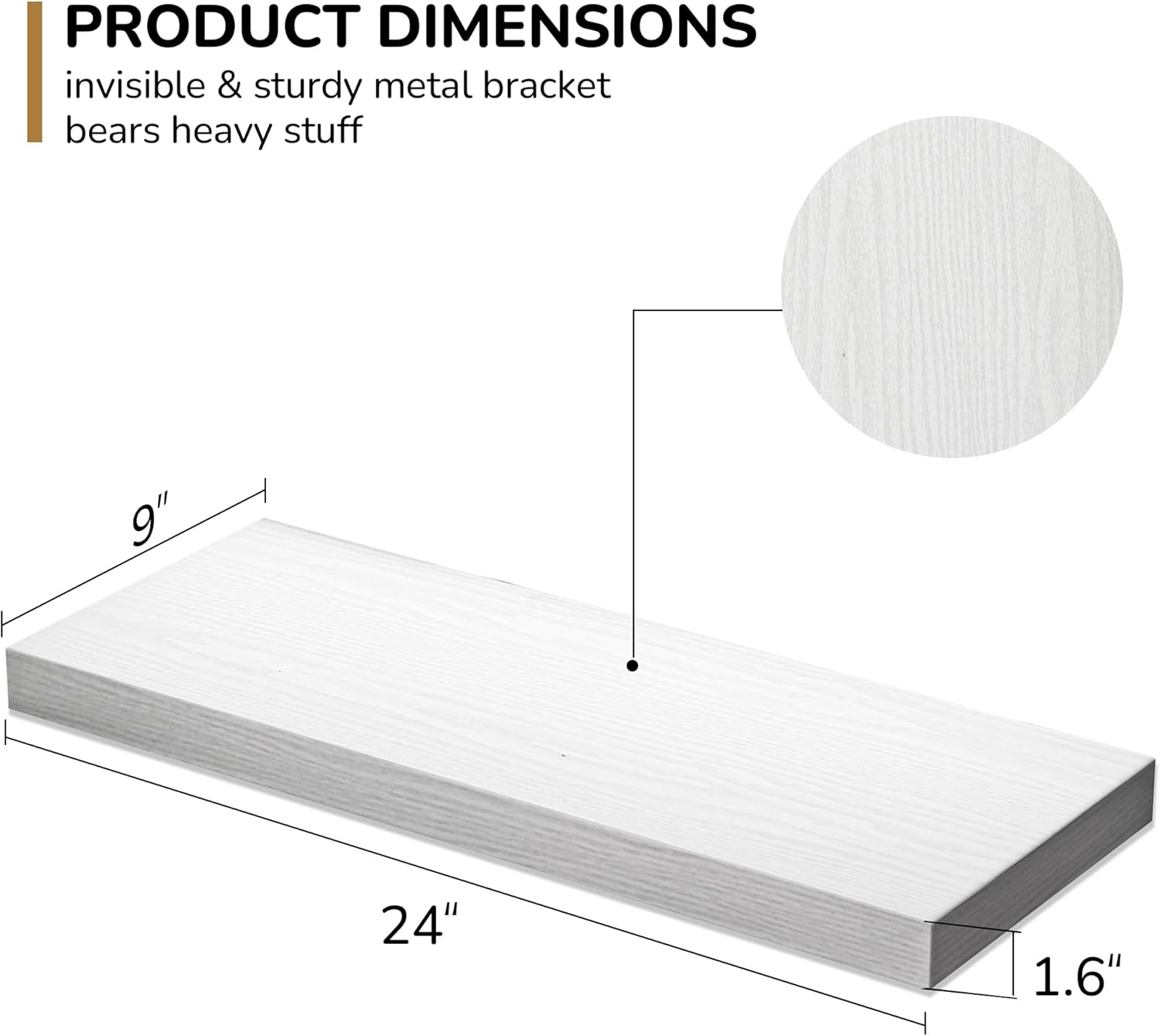 - Extra Deeper & Thicker - Each board measures 24"W x 9"D x 1.6"H. Extra deeper and thicker design in order to bring maximizes storage space and weight capacity, even hold up to 50 lb each. This floating shelf taking up zero square feet, reduces clutter and highlights dรฉcor in compact spaces.