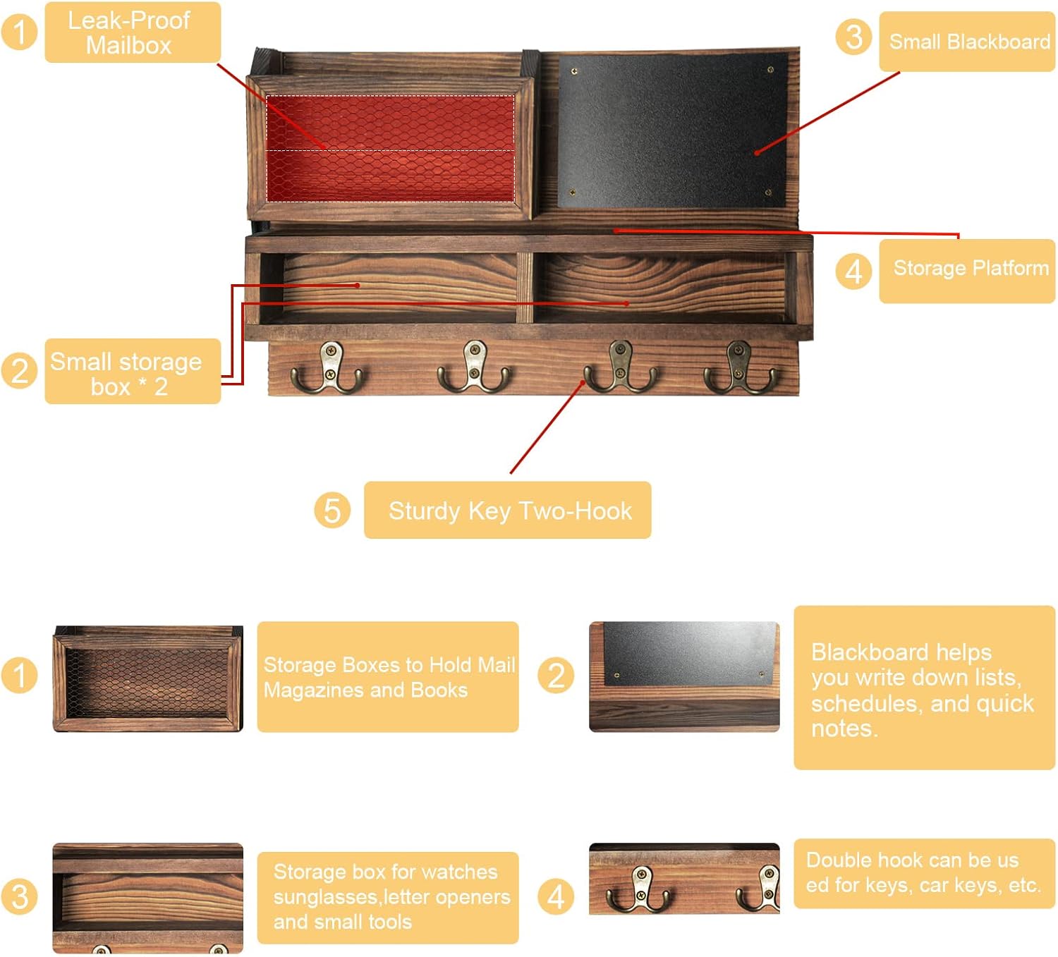 - π‘ Multiple Storage Shelves βΊ This organizer wall-mounted key holder integrates 4 double-sided key hooks, mail organizer, chalkboard sticky note and 2 storage box. You can use the hanging organizer to hold keys, mail, wallets, sunglasses, hats, umbrellas, and more. This way you won't lose your keys and mail in the chaos as a result.