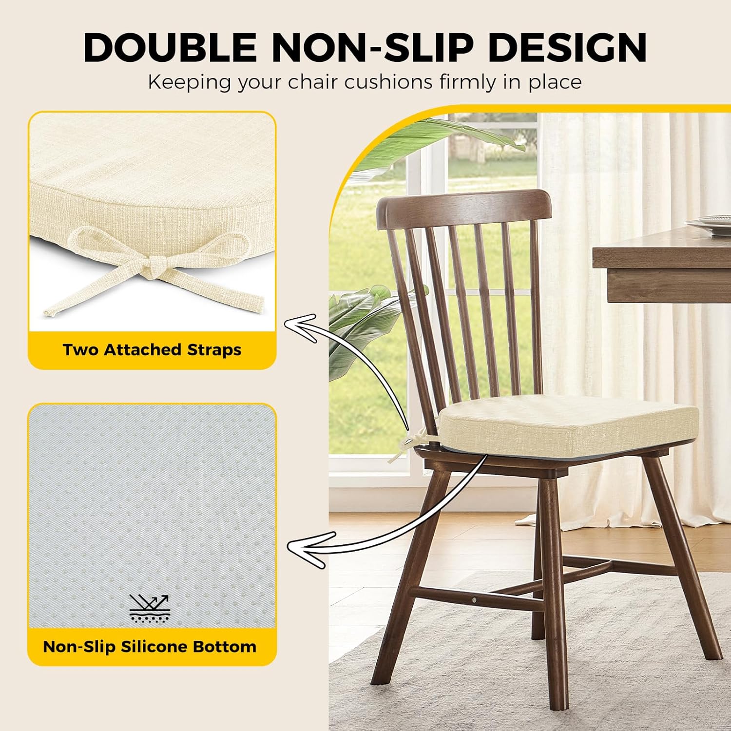 - Stay in Place: Attached ties and non-slip silicone bottom can double keep the seat cushion in place absolutely to prevent it from sliding. You don't need to adjust the dining chair cushions many times and just concentrate on enjoying your life