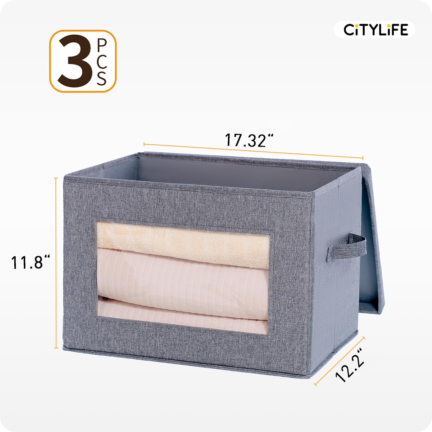 Citylife 3-Pack Collapsible Storage Bins with Lids, Linen Fabric Foldable Storage Boxes, Cube Closet Organization for Clothes, Blankets and Books, Gray