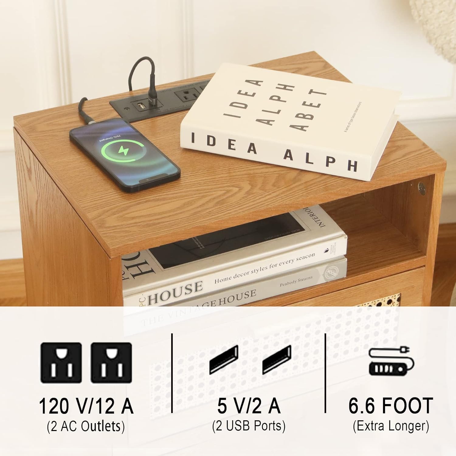 MaxSmeo Mid Century Modern Nightstand with Charging Station, Bedside Tables with Rattan Drawer, Small Wood Nightstand Side Table for Living Room,Bedroom (Brown)