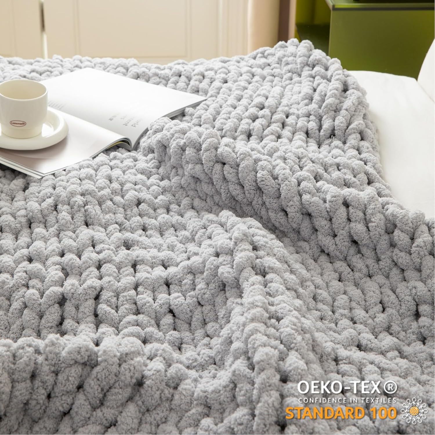 WESHIONGOO Chunky Knit Blanket Throw 40"×40" Knitted Throw Blankets for Couch Bed Fluffy Soft Blanket with Jumbo Chenille Yarn Thick 100% Handmade (Light Grey)