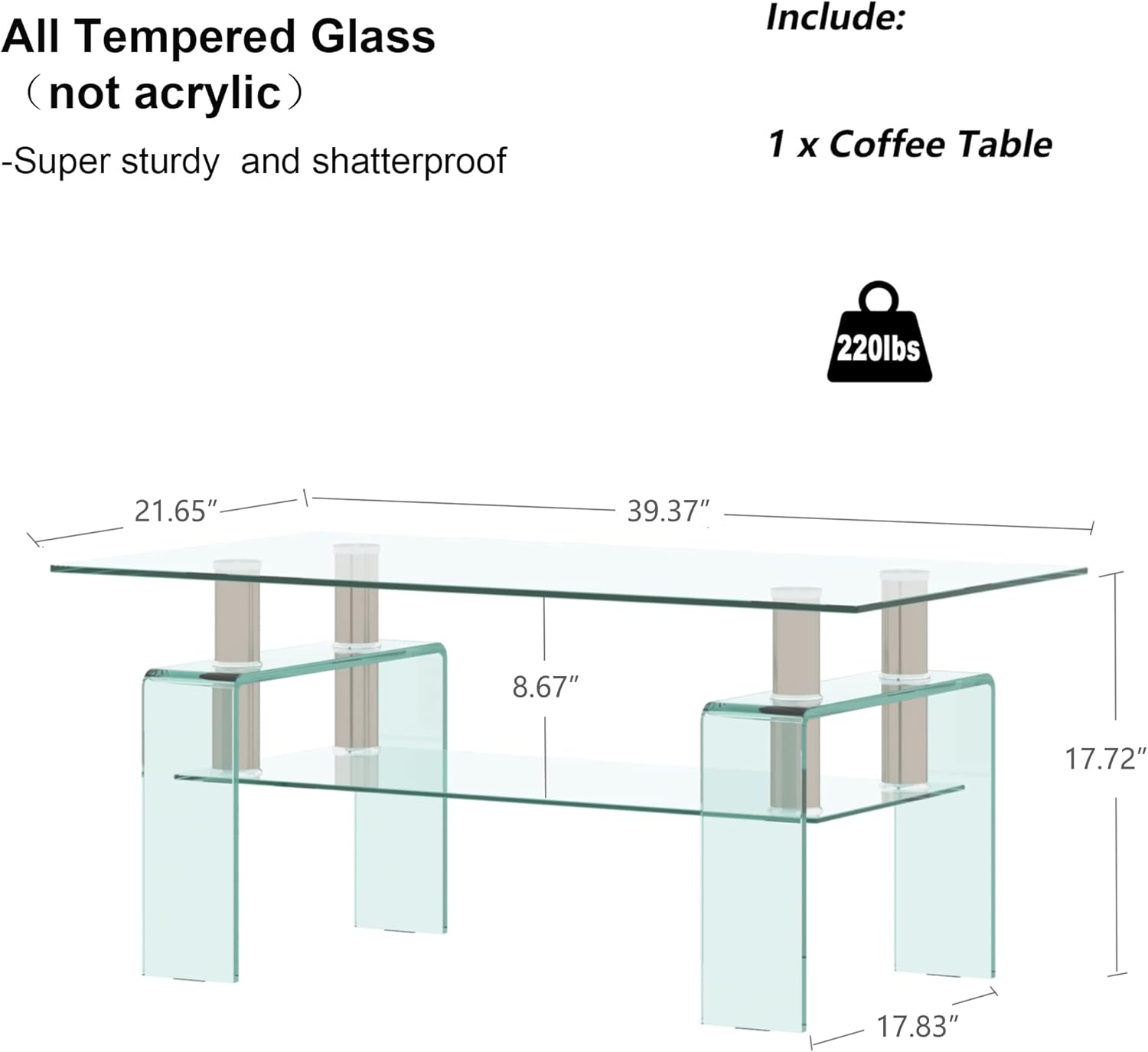 - Glass Coffee Table Size - The table size is 39.37β x 21.65β x 17.72β. The top glass thickness of 8mm and bottom glass is 6mm, the glass leg of 12mm provides high capacity of 220lbs.