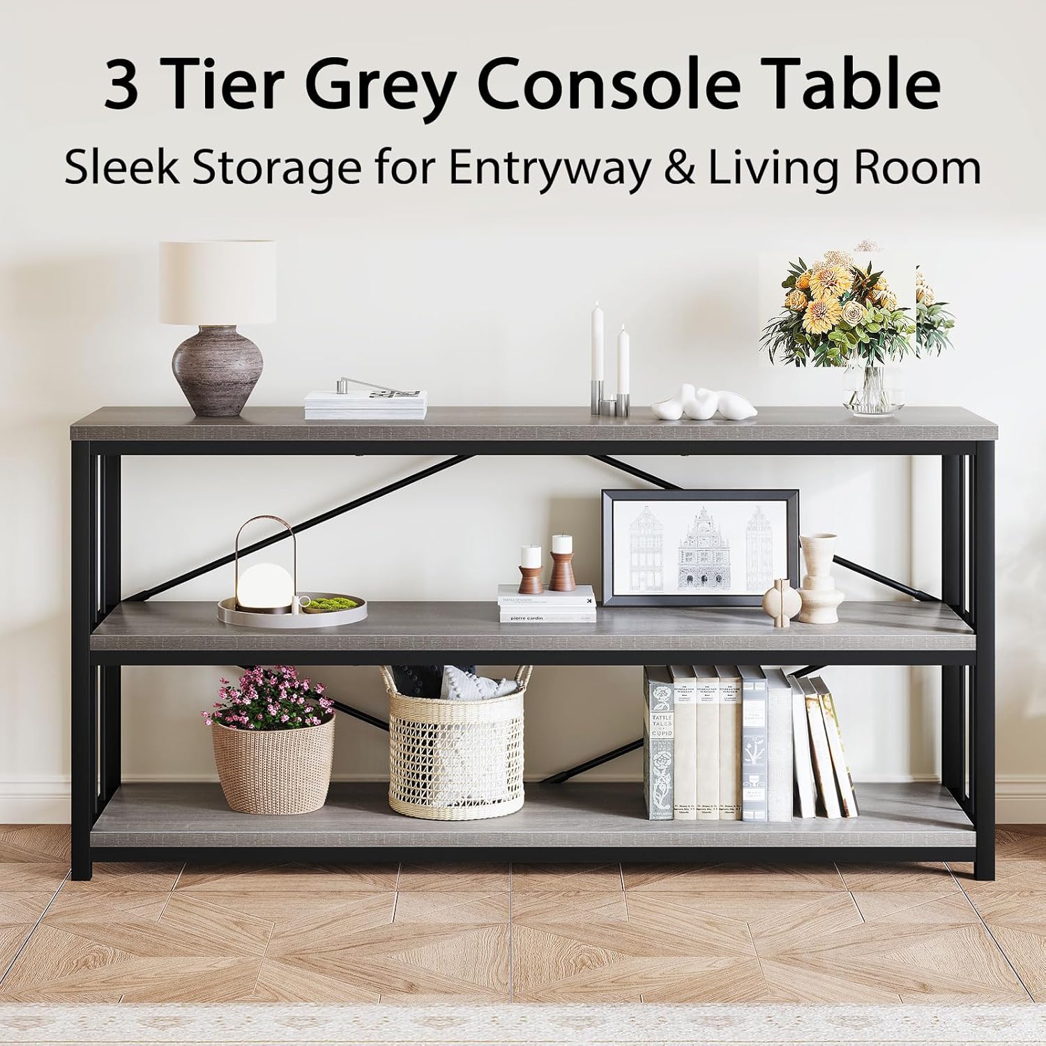 LVB Long Console Table with Storage, Farmhouse Rustic Skinny Entryway Table, Modern Wood Metal Hallway Sofa Table with Shelf, Industrial Narrow Couch Entry Table for Foyer Living Room, Light Grey, 63