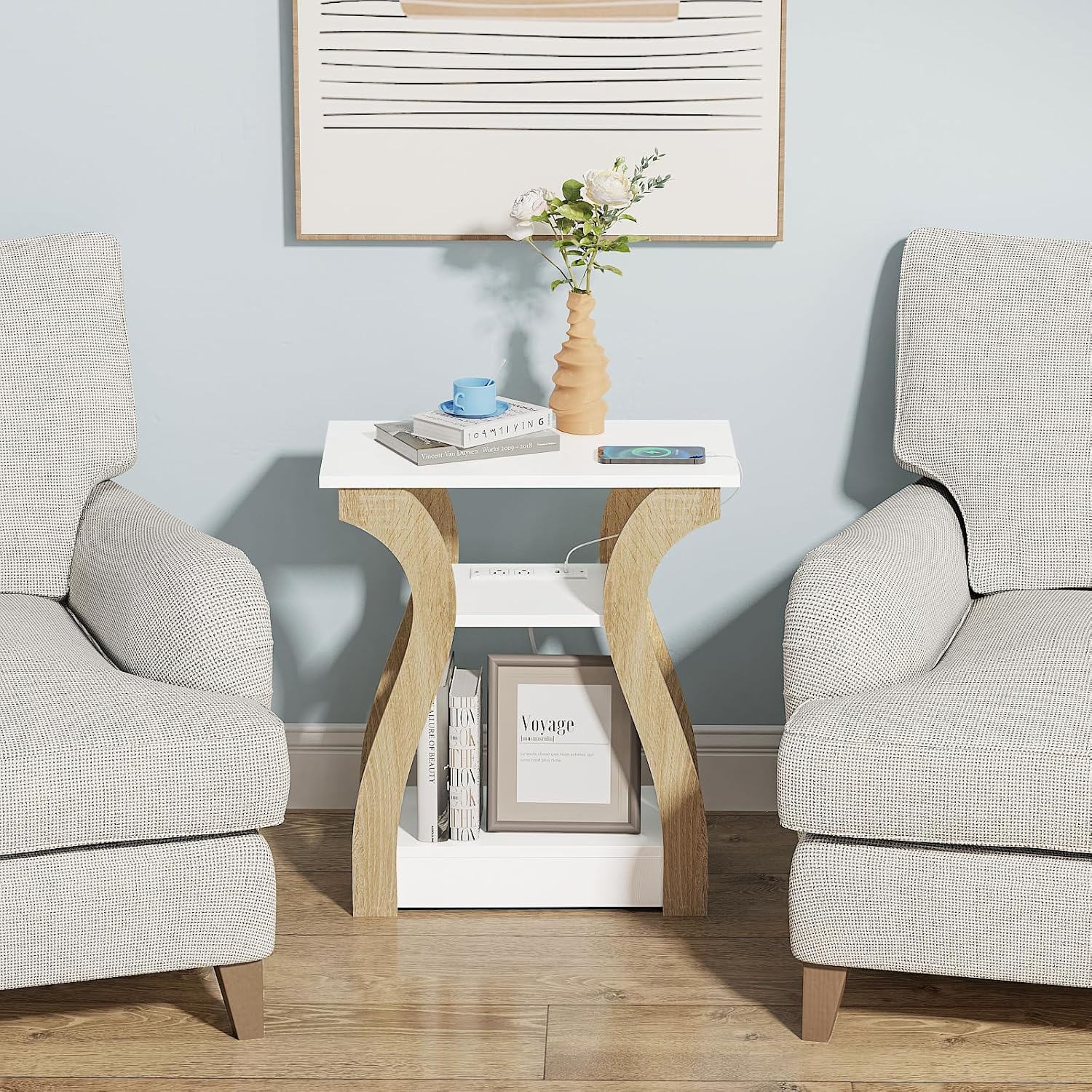 End Table with Charging Station, Side Table with USB Ports and Outlets, Nightstand, 3 Tier End Table with Storage Shelf for Living Room, Bedroom (White)