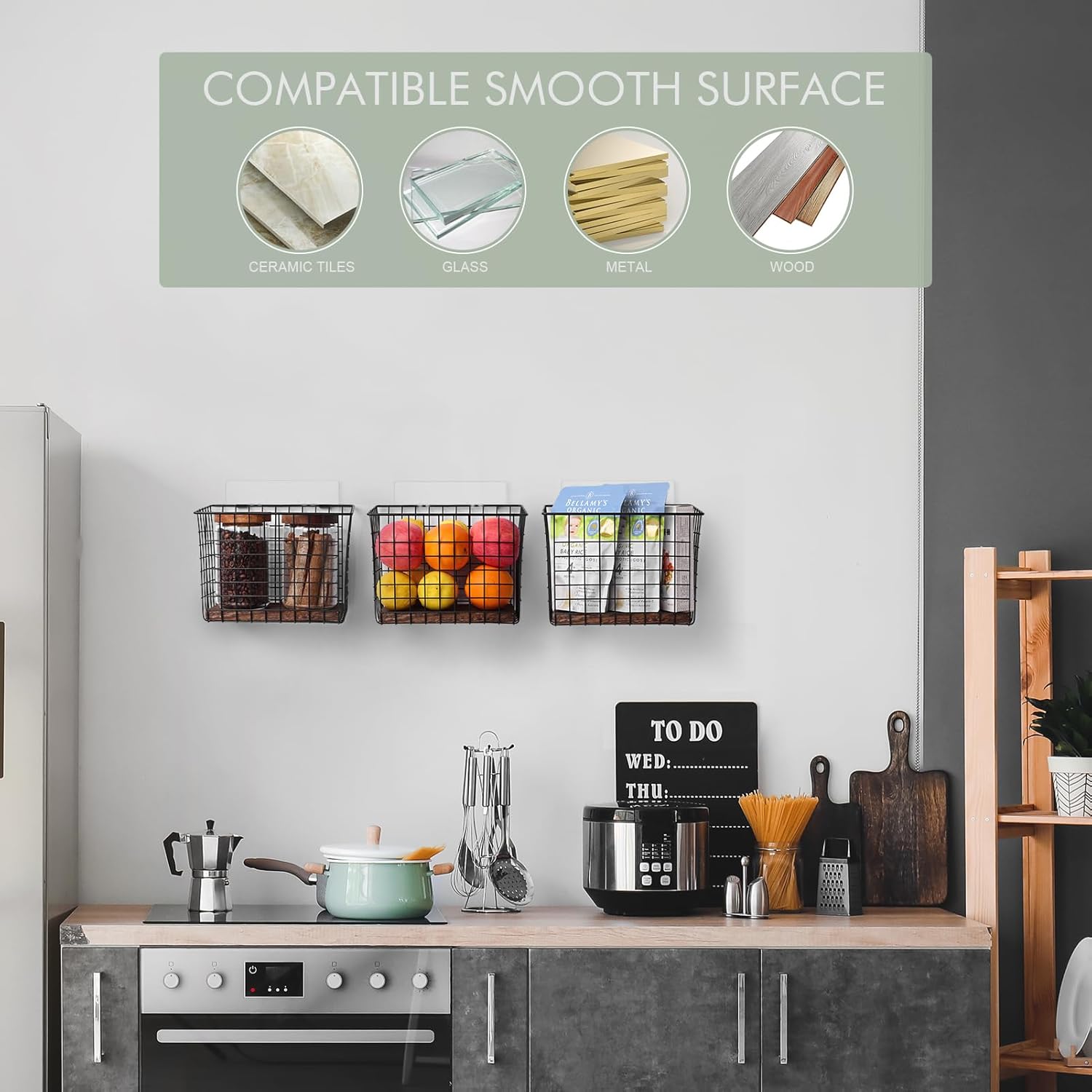 - Flexible Installation - 2 wall mount solutions. Come with adhesive stickers and a screw hook set. The non-trace stickers for holding things below 22 lbs in baskets work with any smooth and clean texture like glass, ceramic, or cabinet. Metal hook screws are available for needs over 44 lbs.