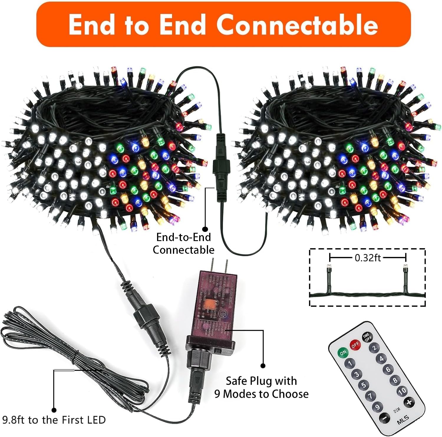- New Upgraded Extendable Plug in String Lights for Christmas Decor: Cool white and multicolor two colors in one set,super bright with new upgraded LED bulbs. This extendable 200 LED green wire plug in string lights have 9 lighting modes to satisfy your diverse decorative effect. Total length is 75.8ft, of which 66ft with lights.
