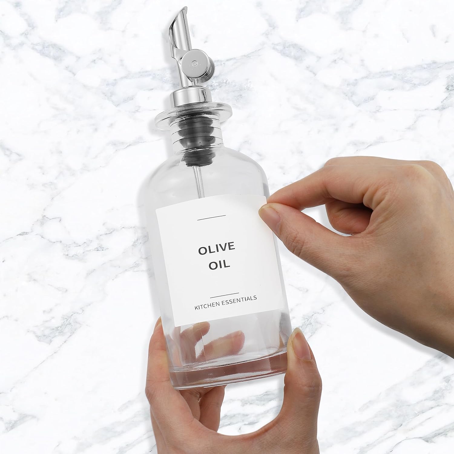 Olive Oil Dispenser Bottle - Includes 55 Kitchen Essential Labels - Cooking Oil Bottles for Kitchen, Coffee Syrup Dispenser - Pourer Spout with 11.8 fl oz Glass Container Cruet - 2pcs Silver