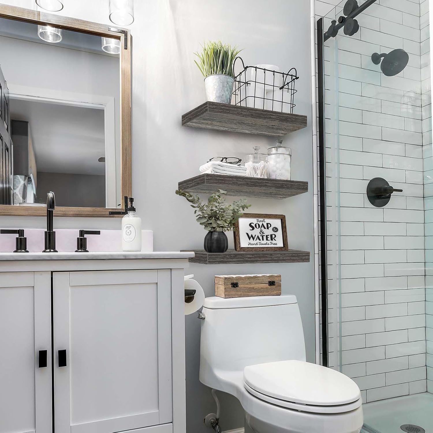 QEEIG Floating Shelves for Wall Bathroom Shelf Bedroom Kitchen Living Room Hanging Book Shelves Small Farmhouse Decor 16 inch Set of 3, Grey (015-GY3)