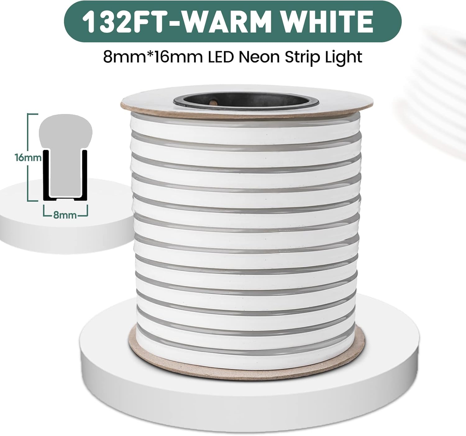 GZBtech Flexible LED Neon Rope Lights 132FT,AC 110-120V Waterproof Strip Light, 120 LEDs/M Cuttable Connectable Neon Lighting for Indoor Outdoor Home Decor/Commercial Building Use-Warm White 40M